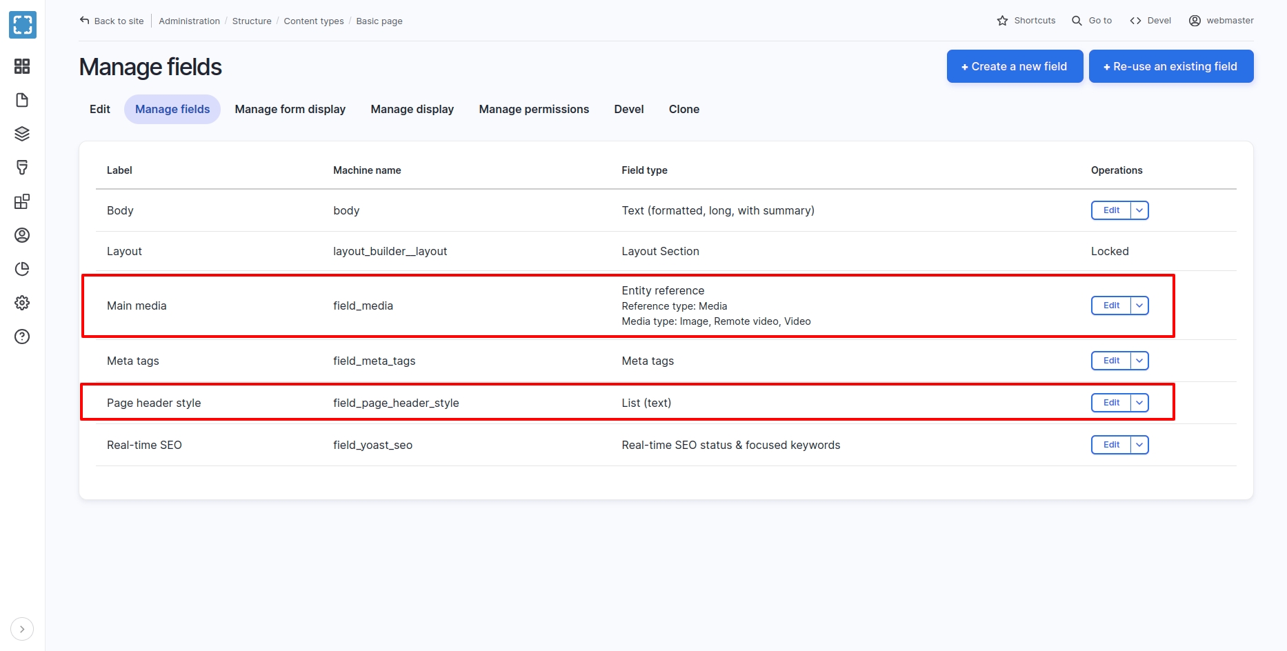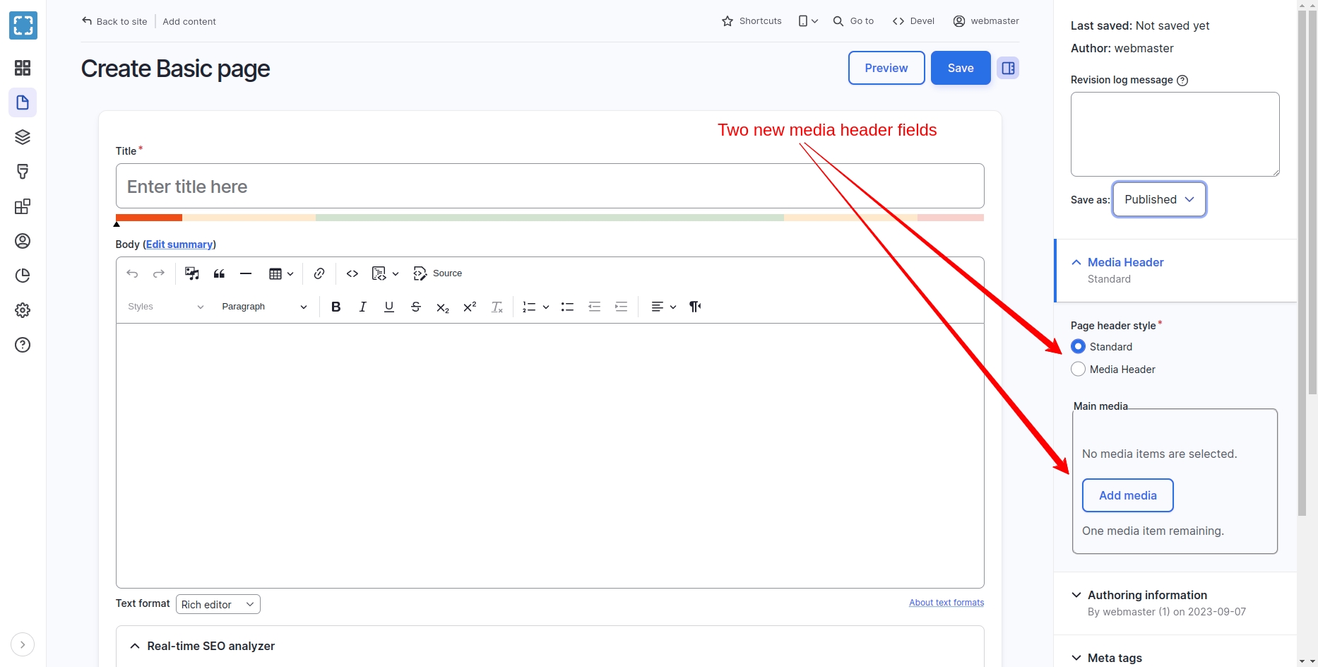 Navigate to Content \ Add content \ Basic page . Then the new two fields should show up in the form. Under the Media Header sidebar form region.