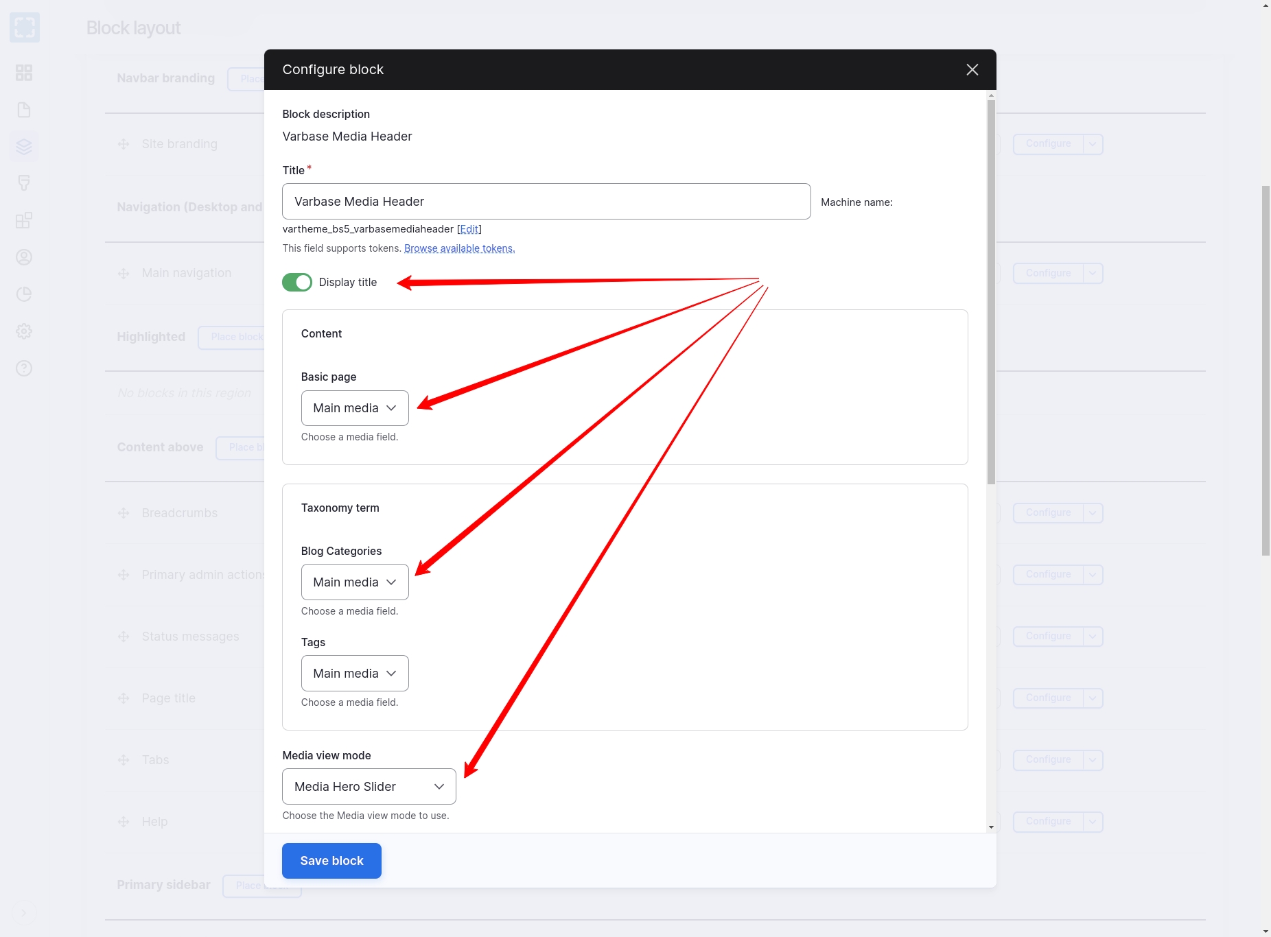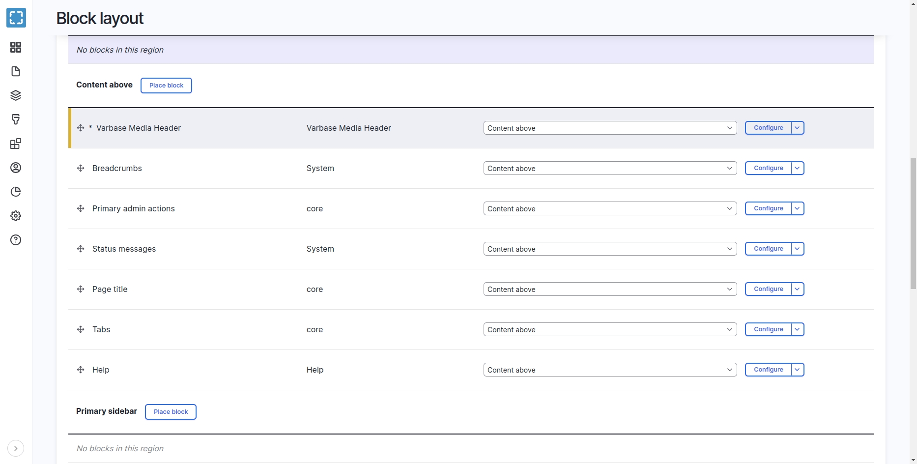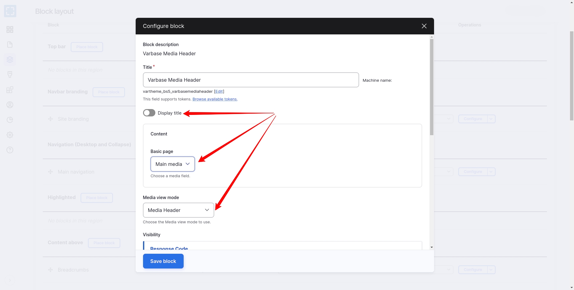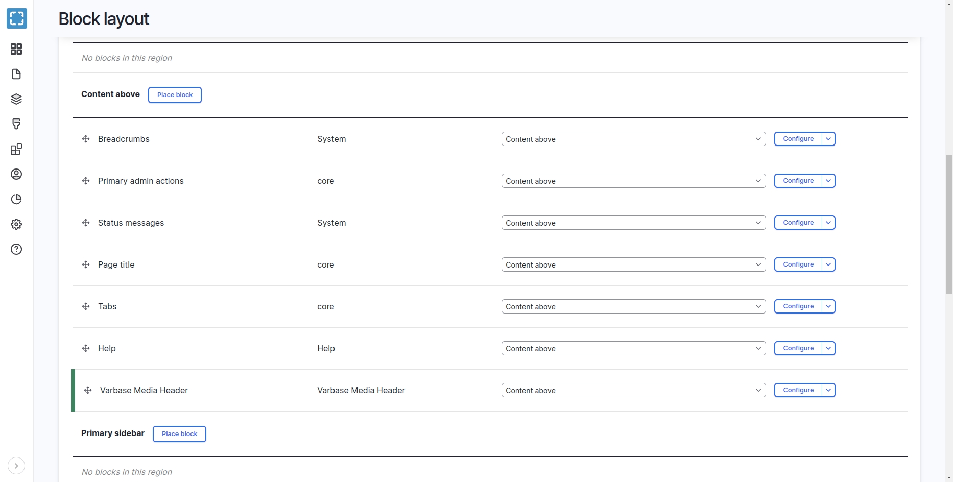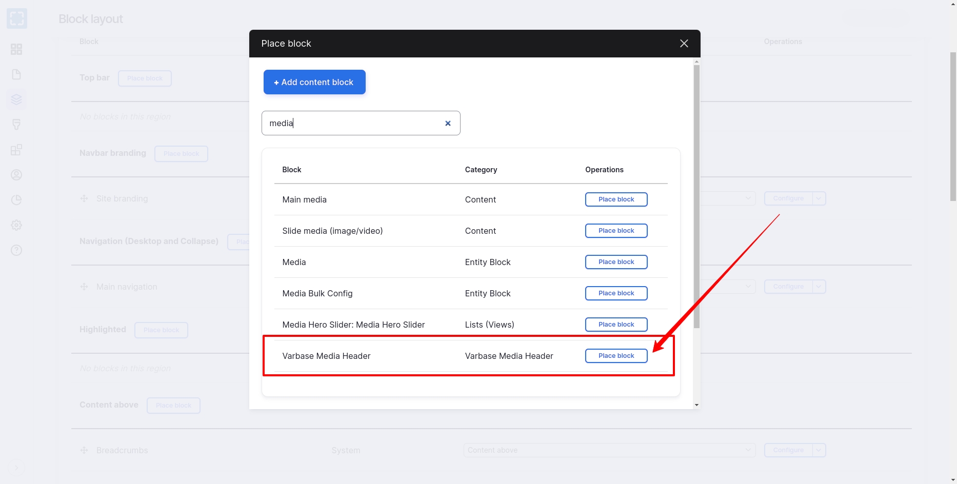Navigate to Structure \ Block layout and place the Varbase Media Header block
