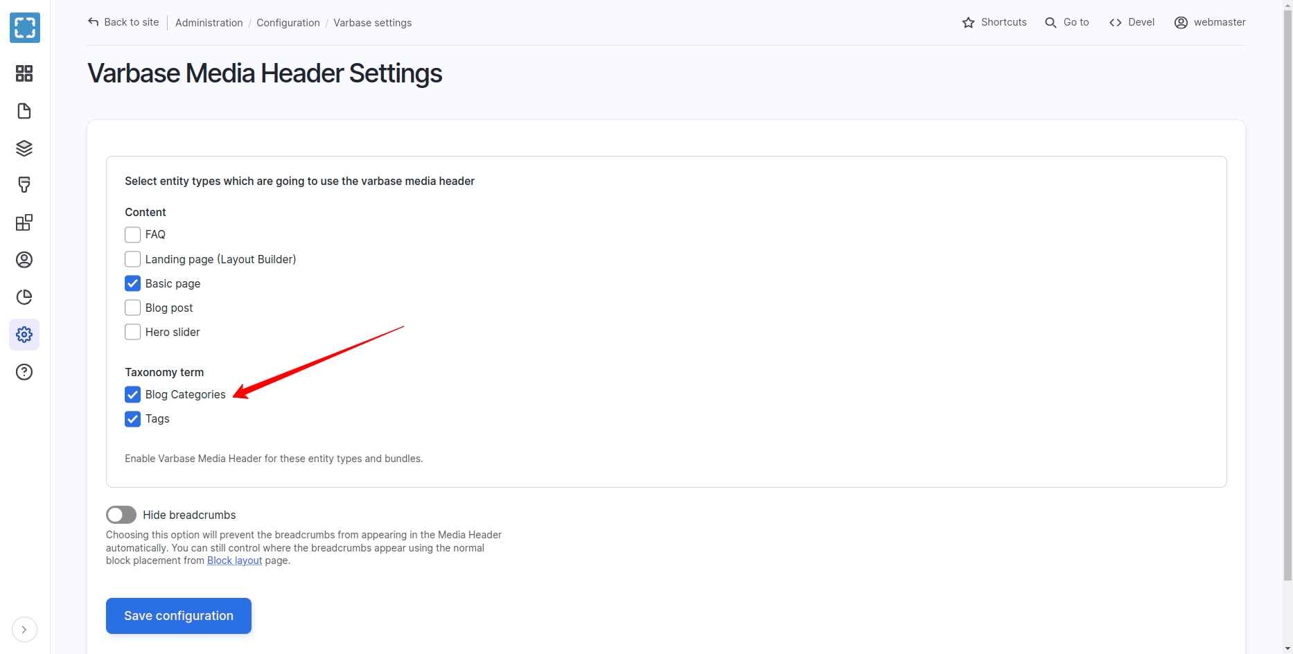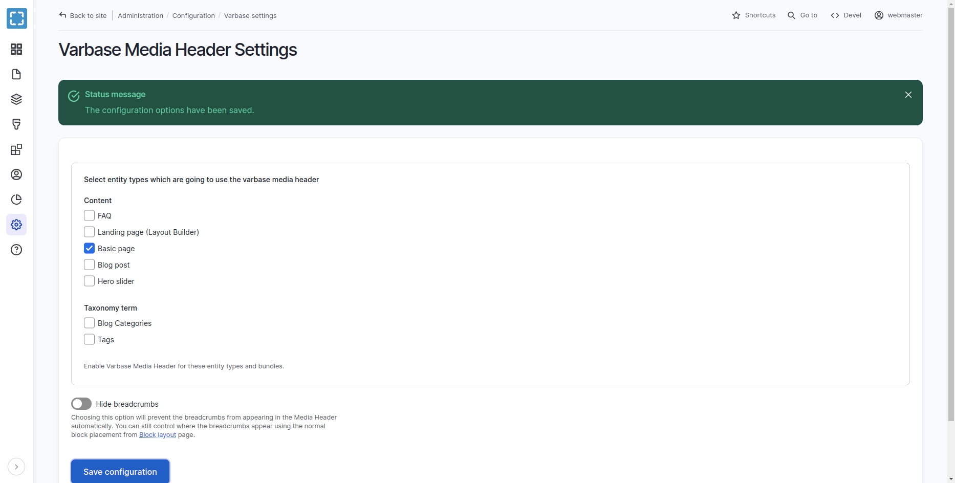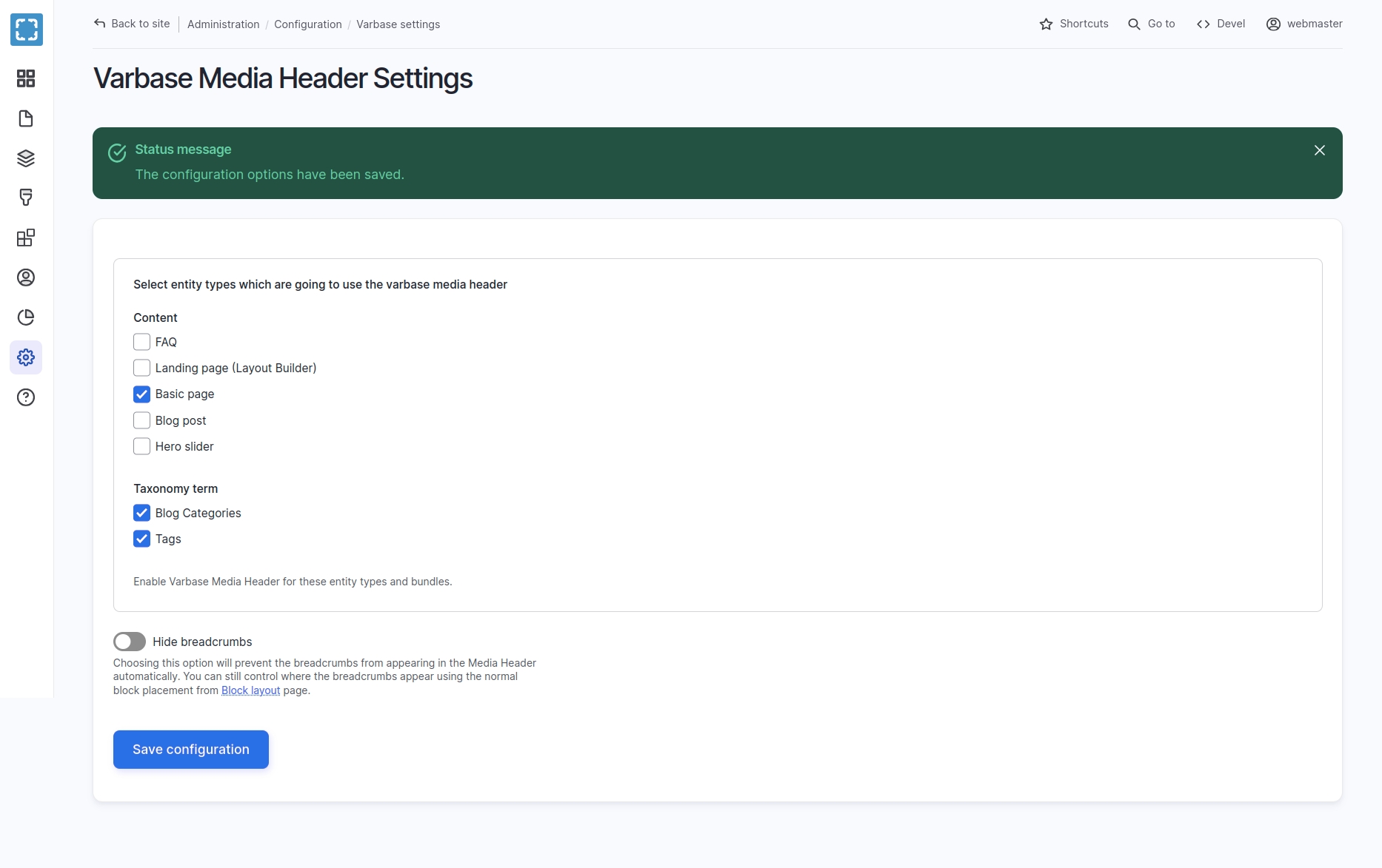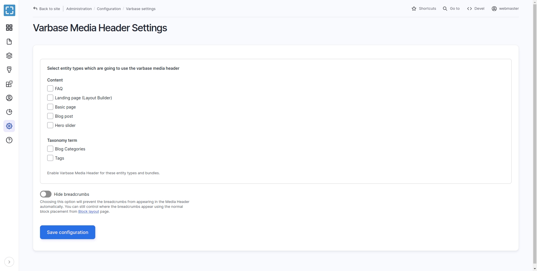 Navigate to Configuration \ Varbase settings \ Varbase Media Header settings