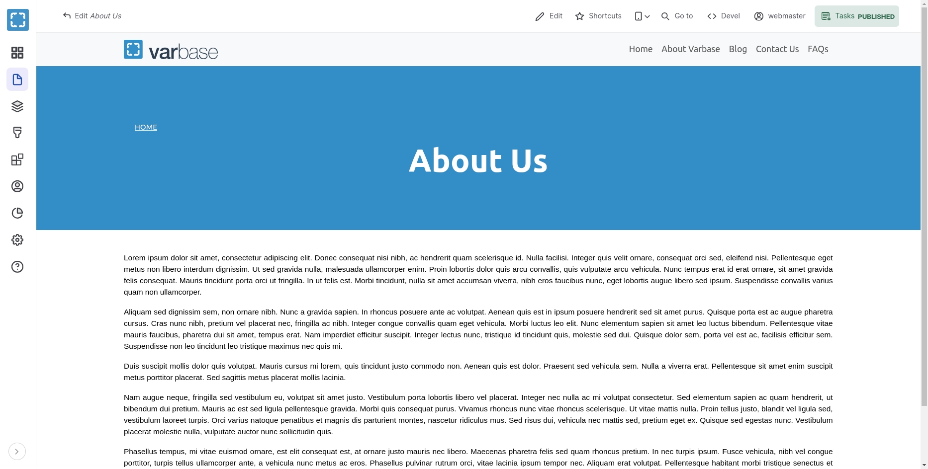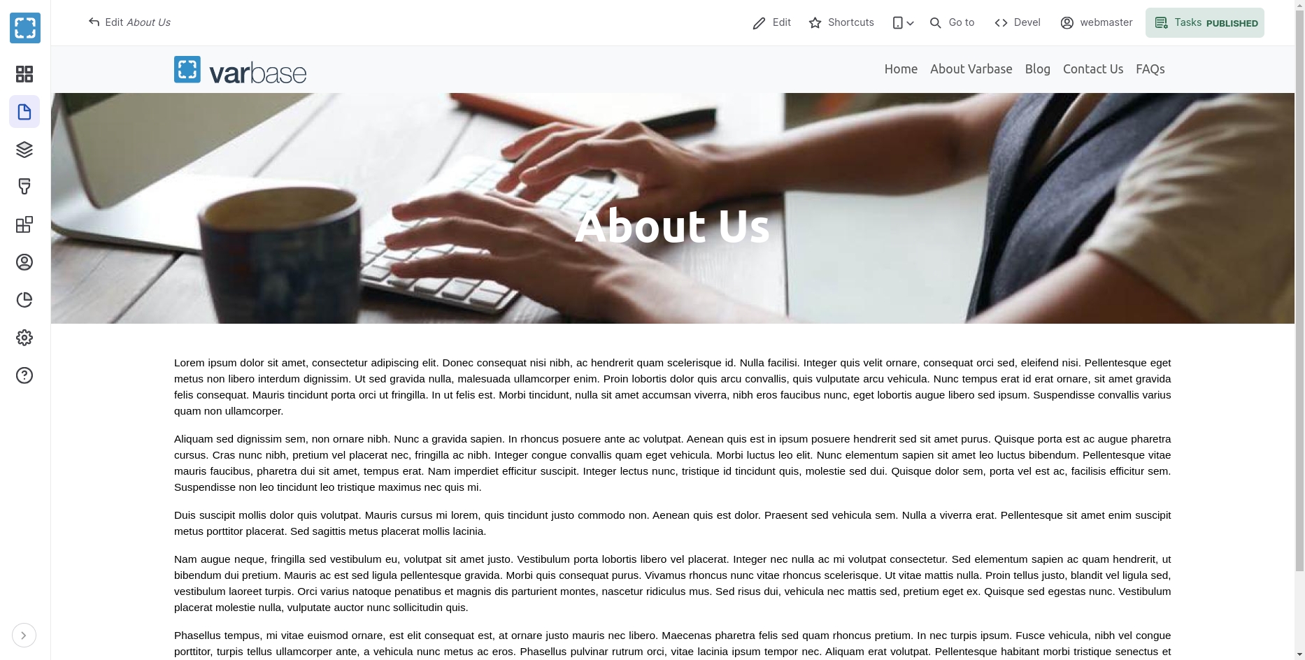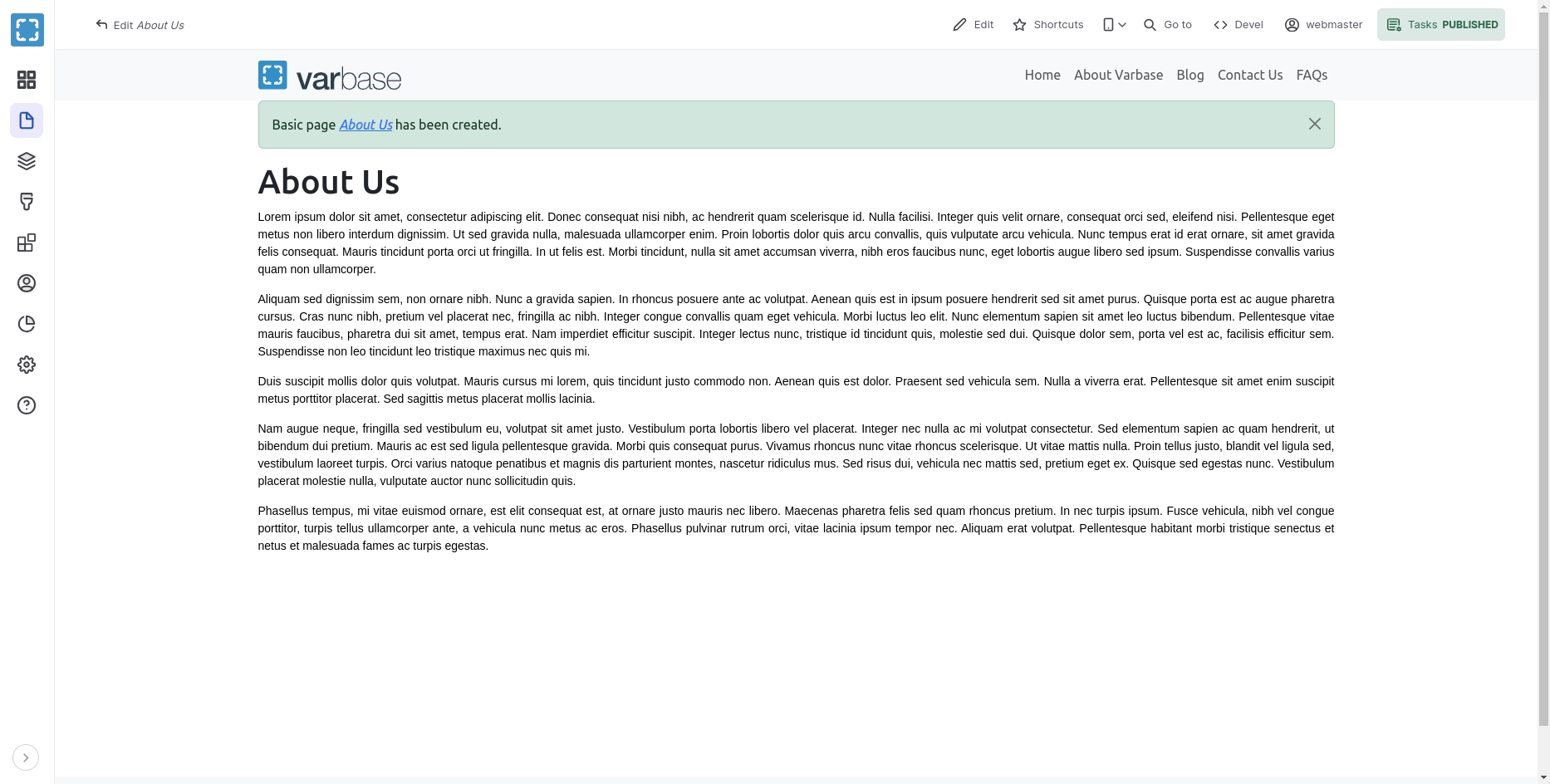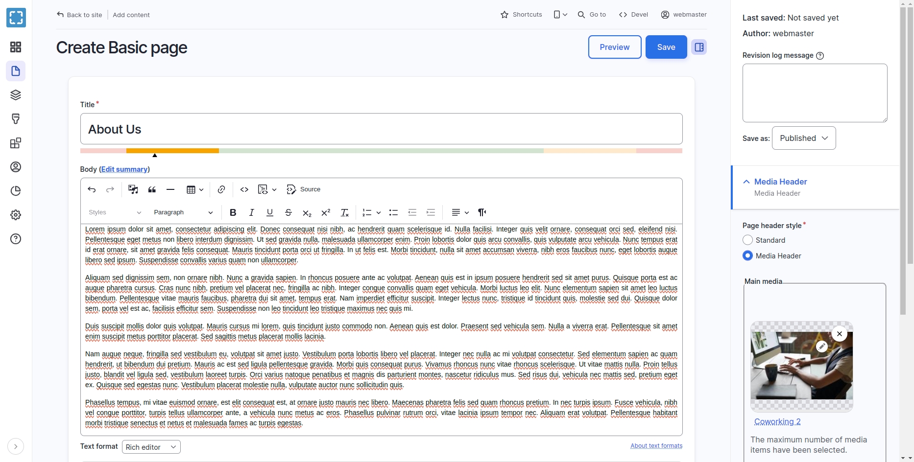 After saving the "Basic page About Us has been created." and the page will look with no media header yet.