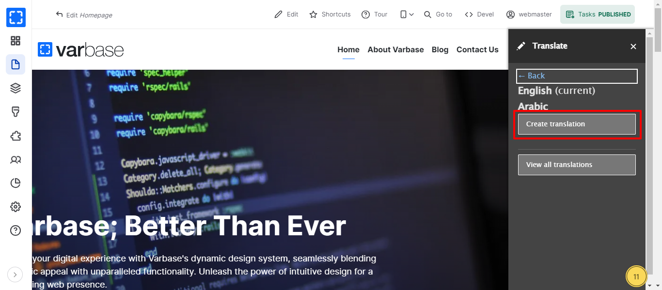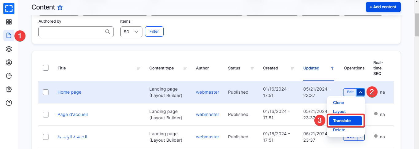 2. In backend there is an edit menu under the content page for each node you can select **Translate** from it and click on the "**Add**" button next to the desired language you want to translate the content into.