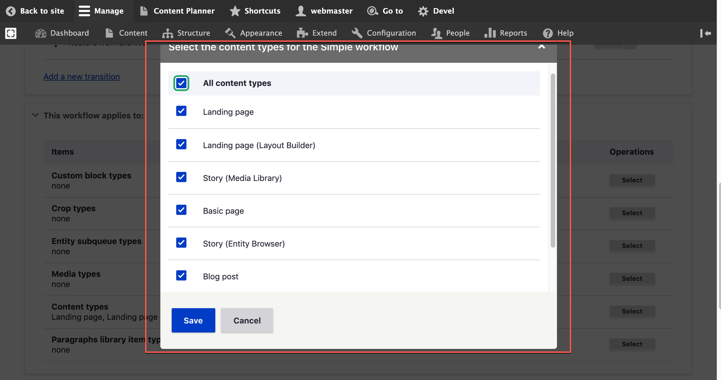 Choose your desired Content Type from the list and click on "Save". Note that Content Types assigned to another Workflow will not appear on this list.