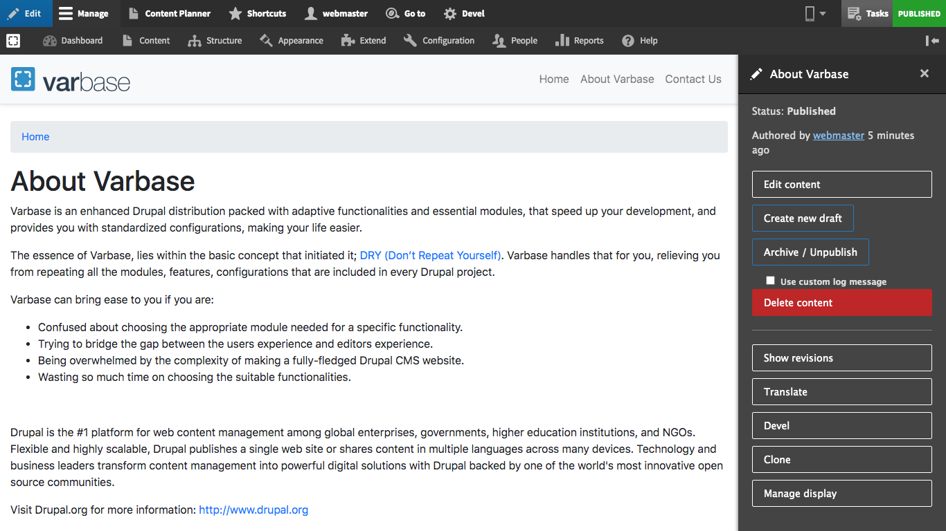 The default Varbase configuration now hides the "Local Tasks" available in content pages in the front-end theme, assuming that the Moderation Sidebar is the alternative method to edit, view, translate, or manage content.
