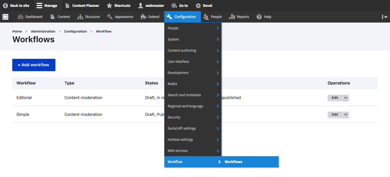 To add a new Workflow or edit an existing one, navigate to: Administration \ Configuration \ Workflow \ Workflows then click on "+Add workflow" for a new Workflow, or "Edit" under Operations for the desired Workflow.
