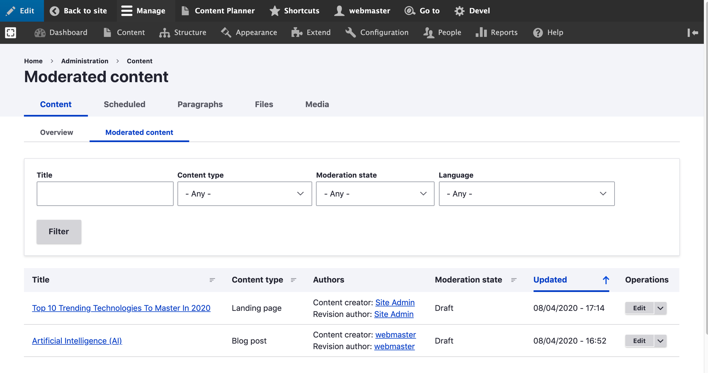 Varbase Workflow adds a simple administration view to show the available drafts and their moderation state. This view is available for all roles who can edit content.