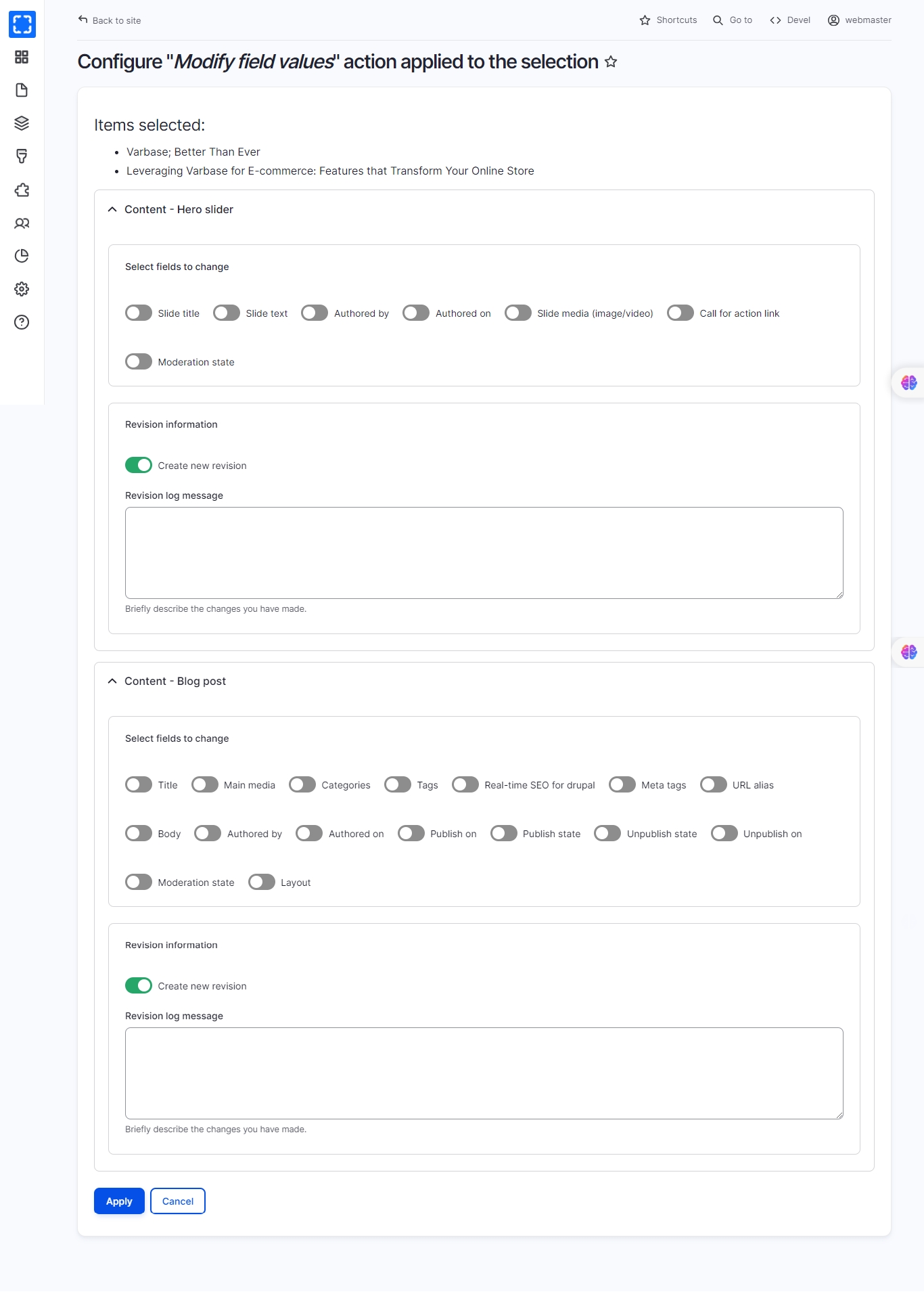 You'll then be presented with a form that contains fields that appear in at least one of the selected nodes. You just need to populate the values as desired (or leave blank if you don't want to change a field) and submit.