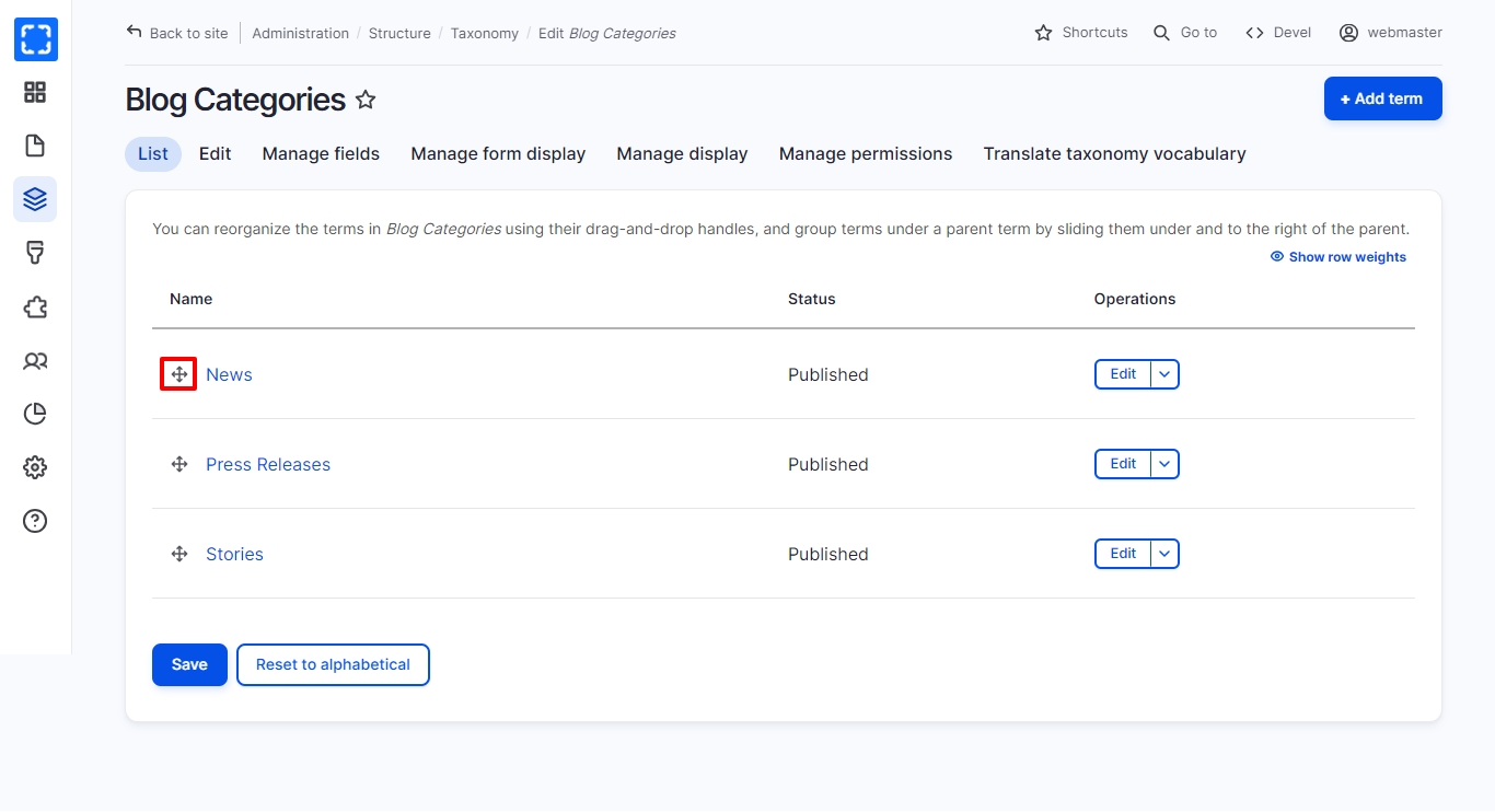 Choose the taxonomy that you want to reorder there terms, Click on List terms.