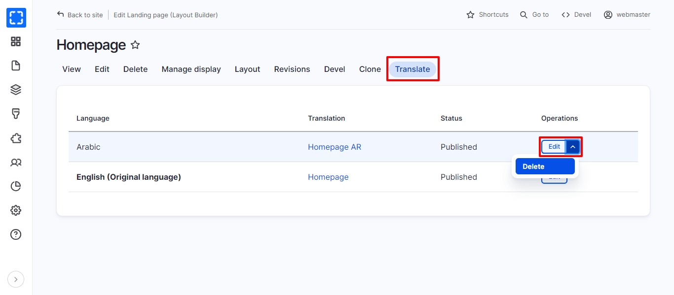 Navigate the translated node page you want to delete.