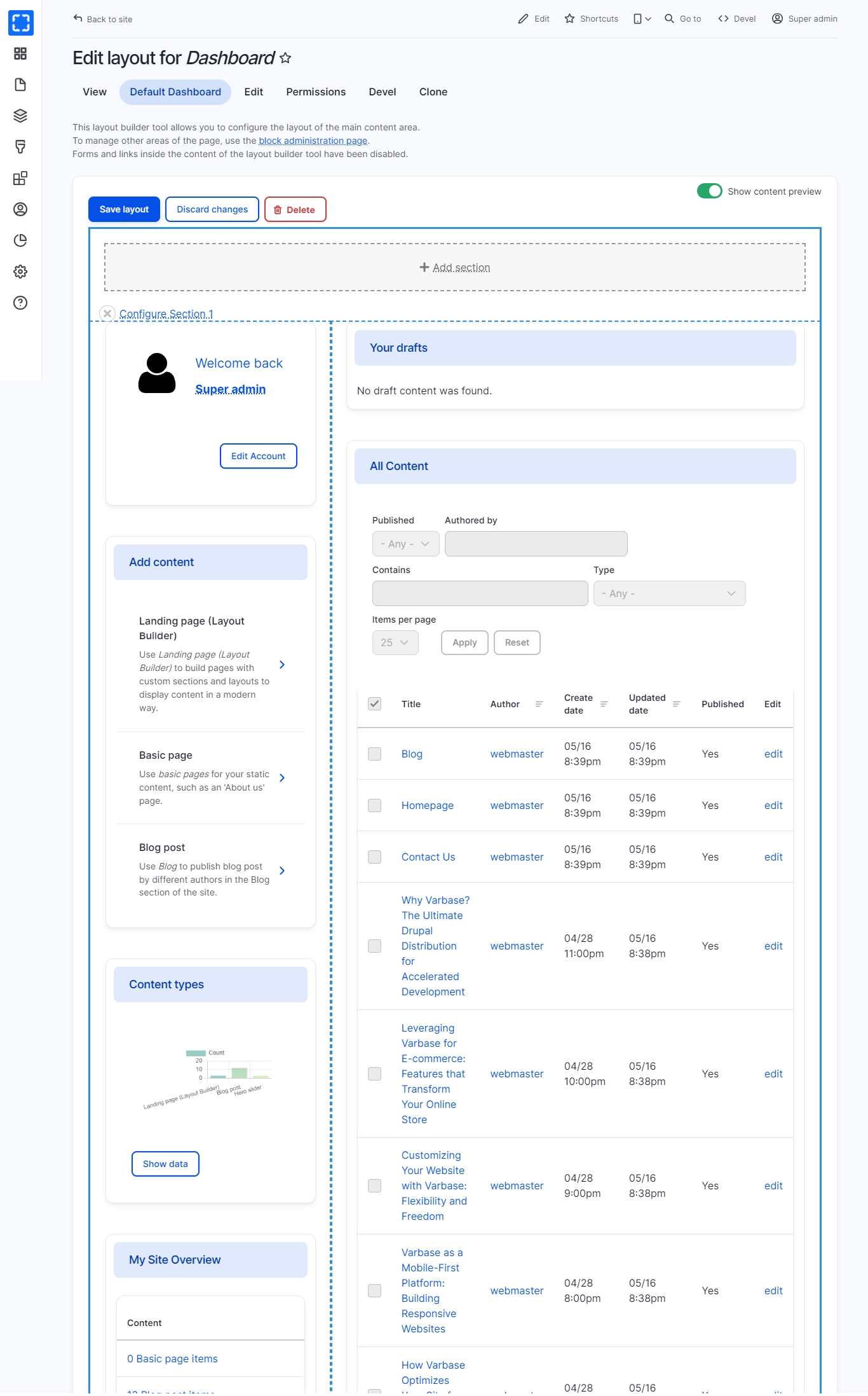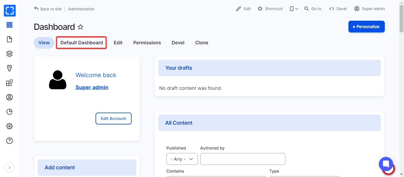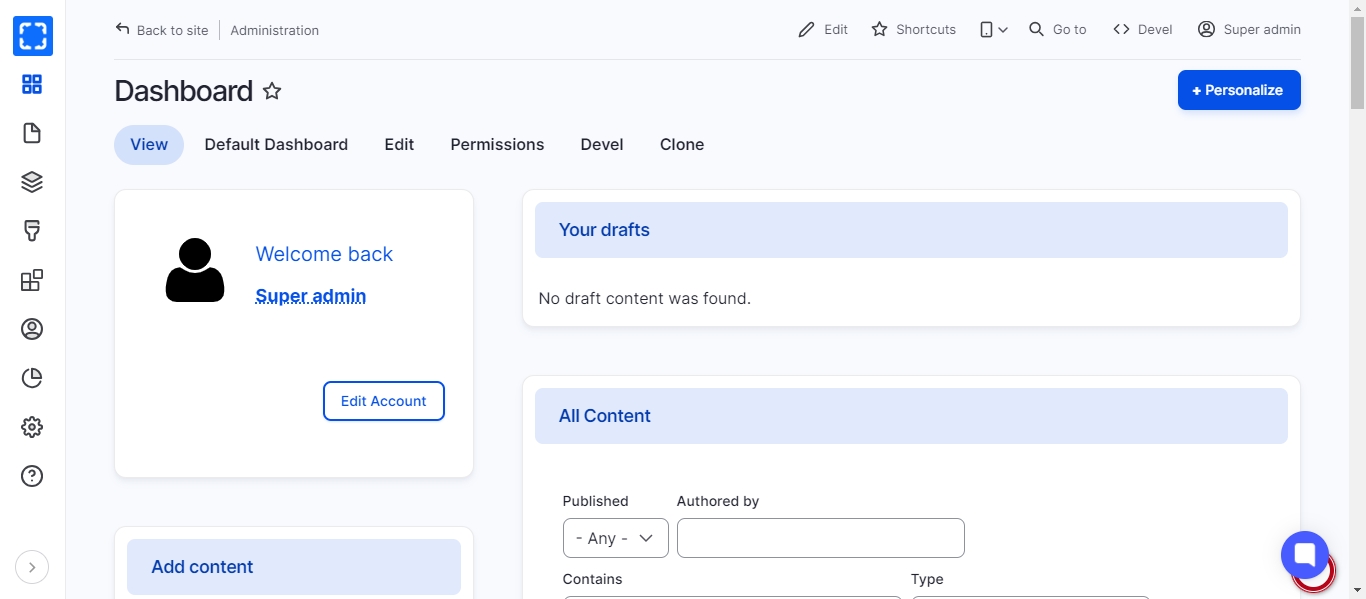 The dashboard gives administrators a customizable overview of important site information.
