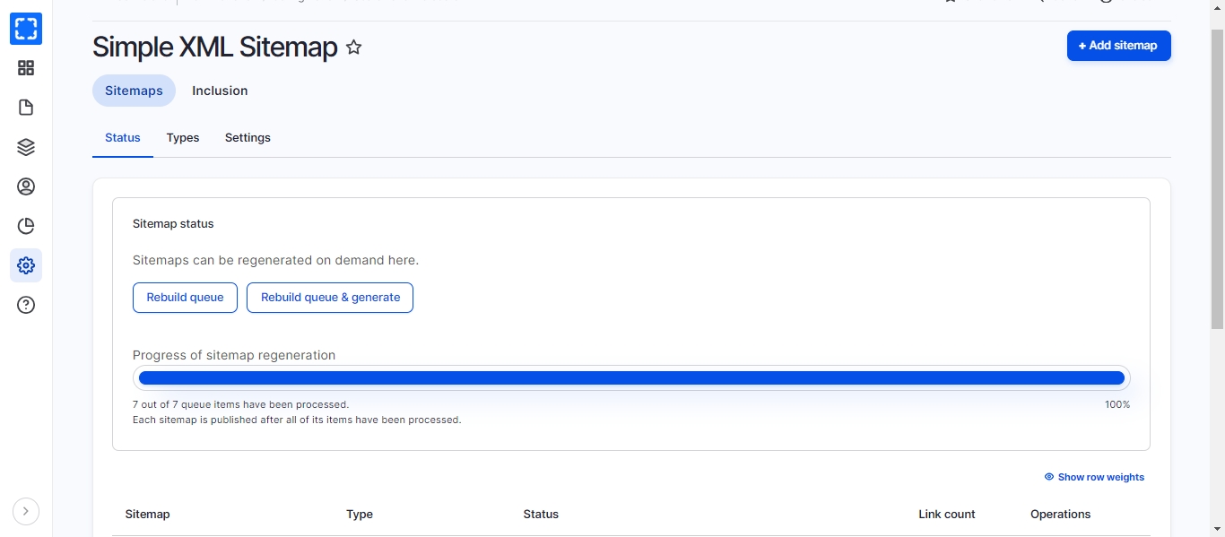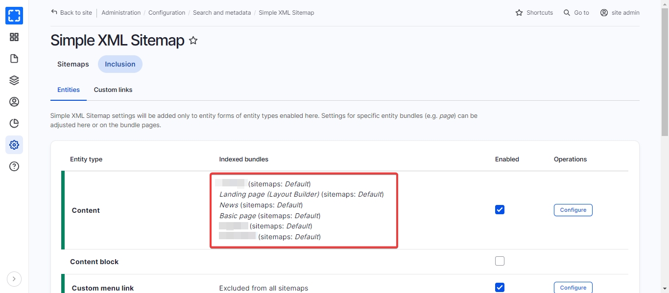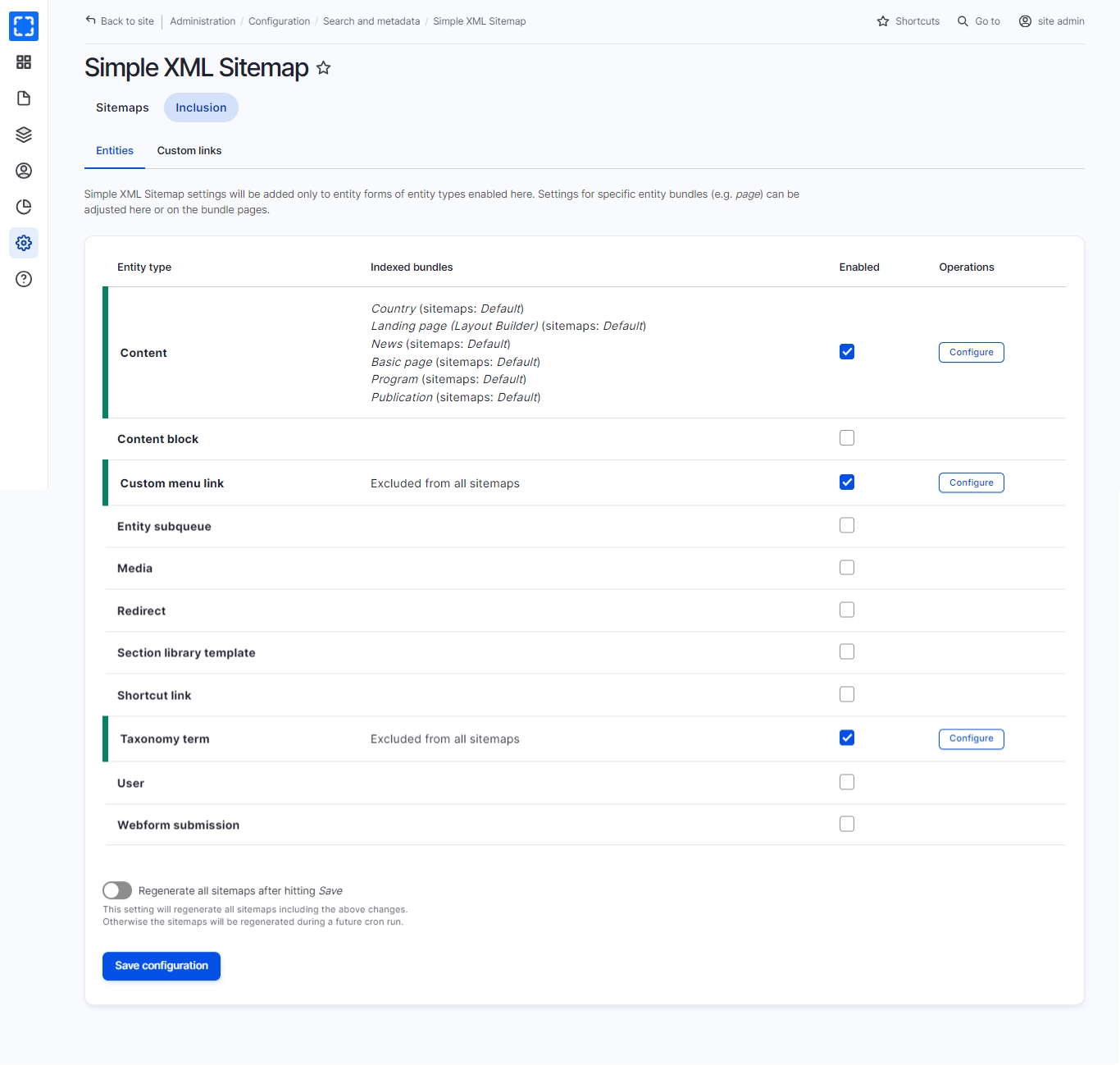 Users can include or exclude any entity on the site in the sitemap for example: Content-types, custom block, menus, entityqueues, taxonomy term, and user profiles to be indexed in the sitemap. To navigate to the XML sitemap inclusion page: Administration \ Configurations \ Search and metadata \ Simple XML Sitemap \ XML Sitemap Inclusion