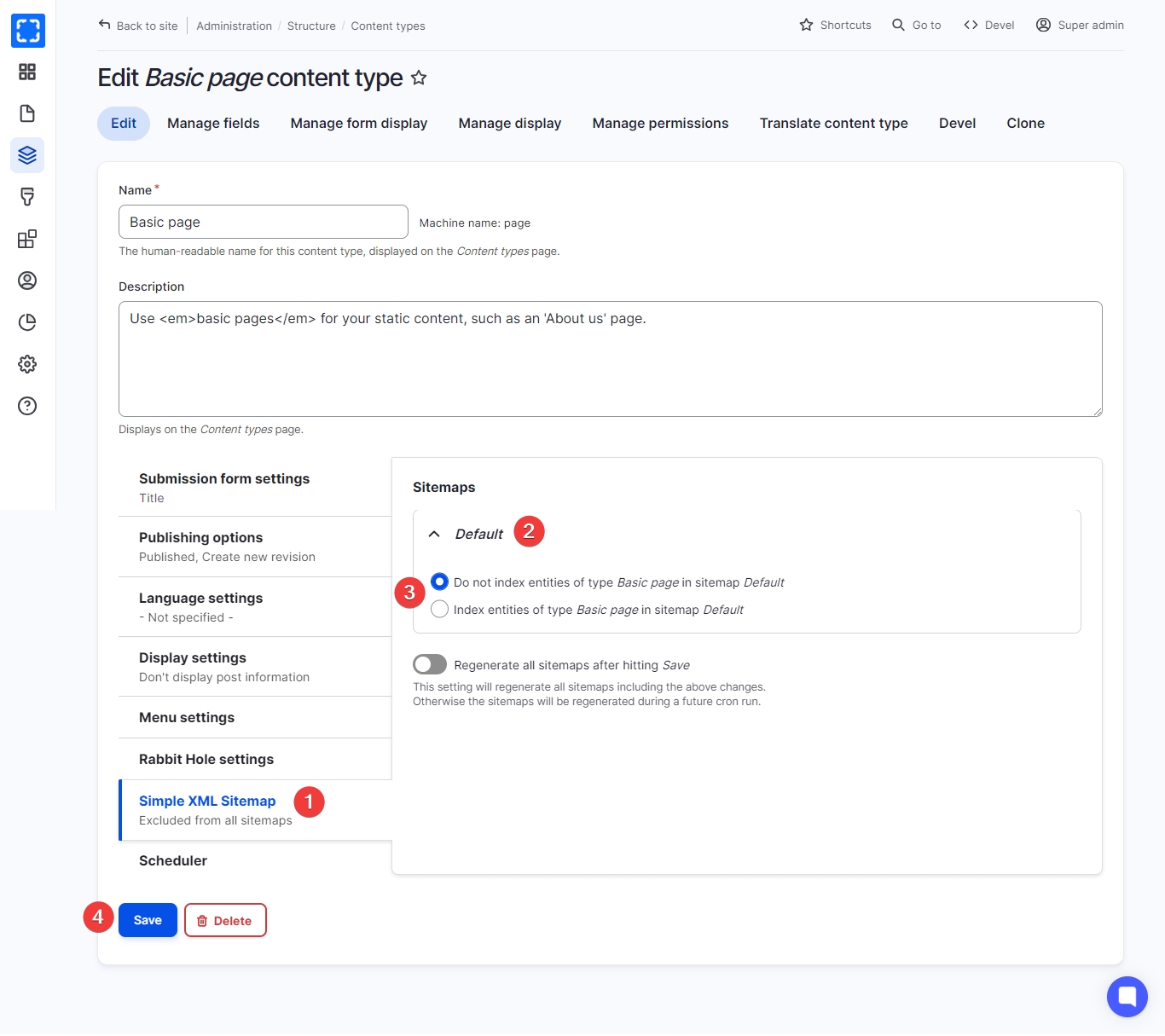 Entities - Here is where you include/exclude entities for example content types from the sitemap.