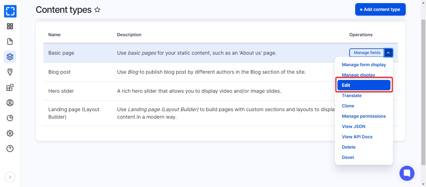 Let us take a Super admin role, remember this role can manage everything on the site. Now let us include the content-type to the XML sitemap, navigate to: Administration \ Structure \ Content-type. After navigating to the content types page, click the drop-down arrow on any content-type for example "Blog post" then click "Edit".