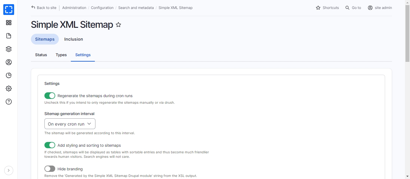 As a Super admin, Site admin, or SEO admin, navigate to Administration \ Configurations \ Search and metadata \ Simple XML Sitemap.