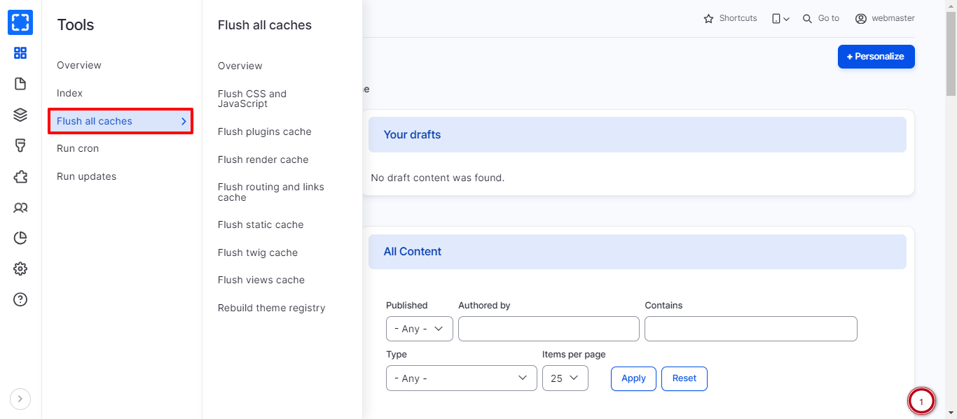 You will notice the *Clear all caches* button, click it. The Varbase will now clear all your caches, this might take a couple of seconds then a message will appear indicating your caches are cleared.