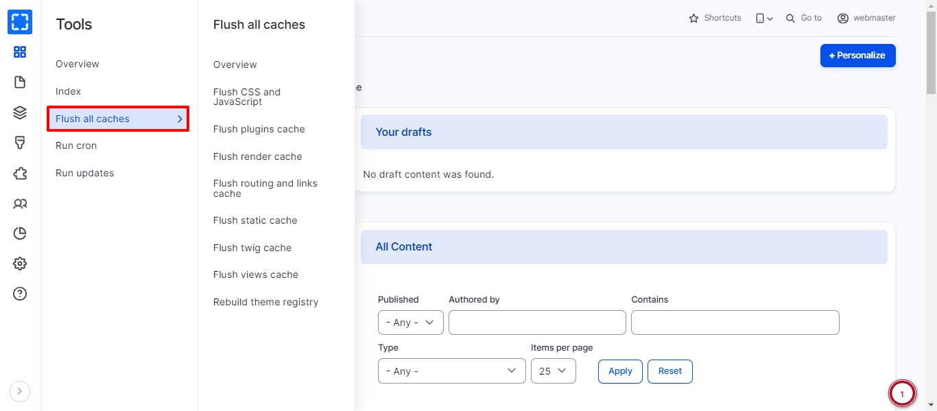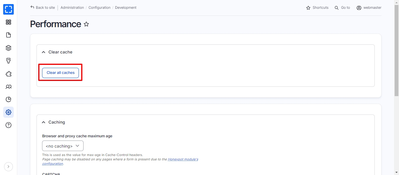 You will notice the Clear all caches button, click it. The Varbase will now clear all your caches, this might take a couple of seconds then a message will appear indicating your caches are cleared.
