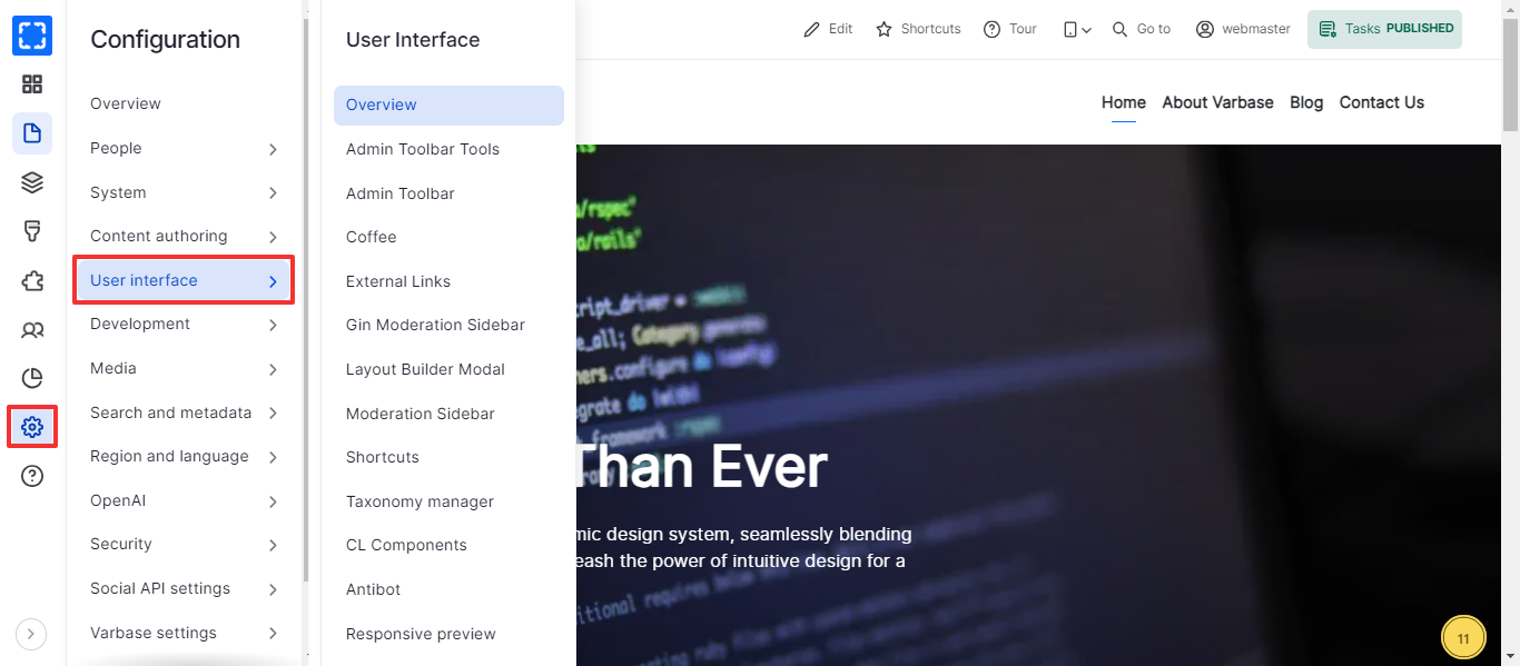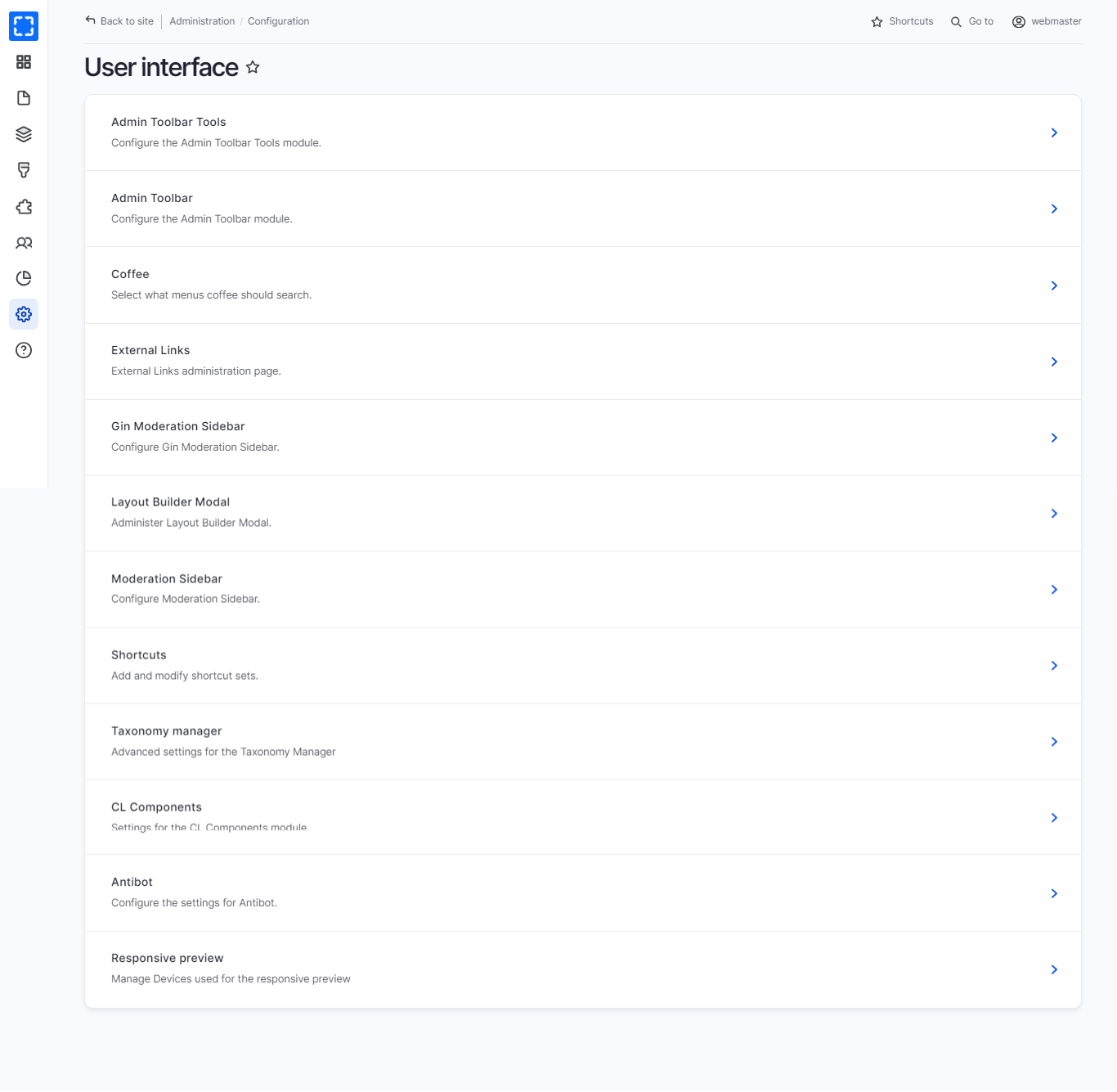 In User interface page the user can manage many functionalities such as **Coffee, External Links, Shortcuts, Moderation Sidebar, Taxonomy Manager, Layout Builder Modal, Tours, ...etc**