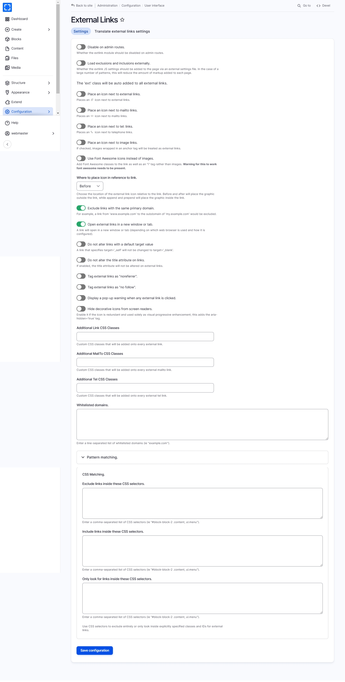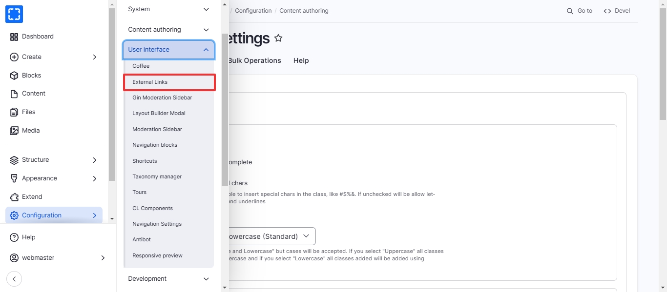 Form Configuration/ User interface/ External Links.