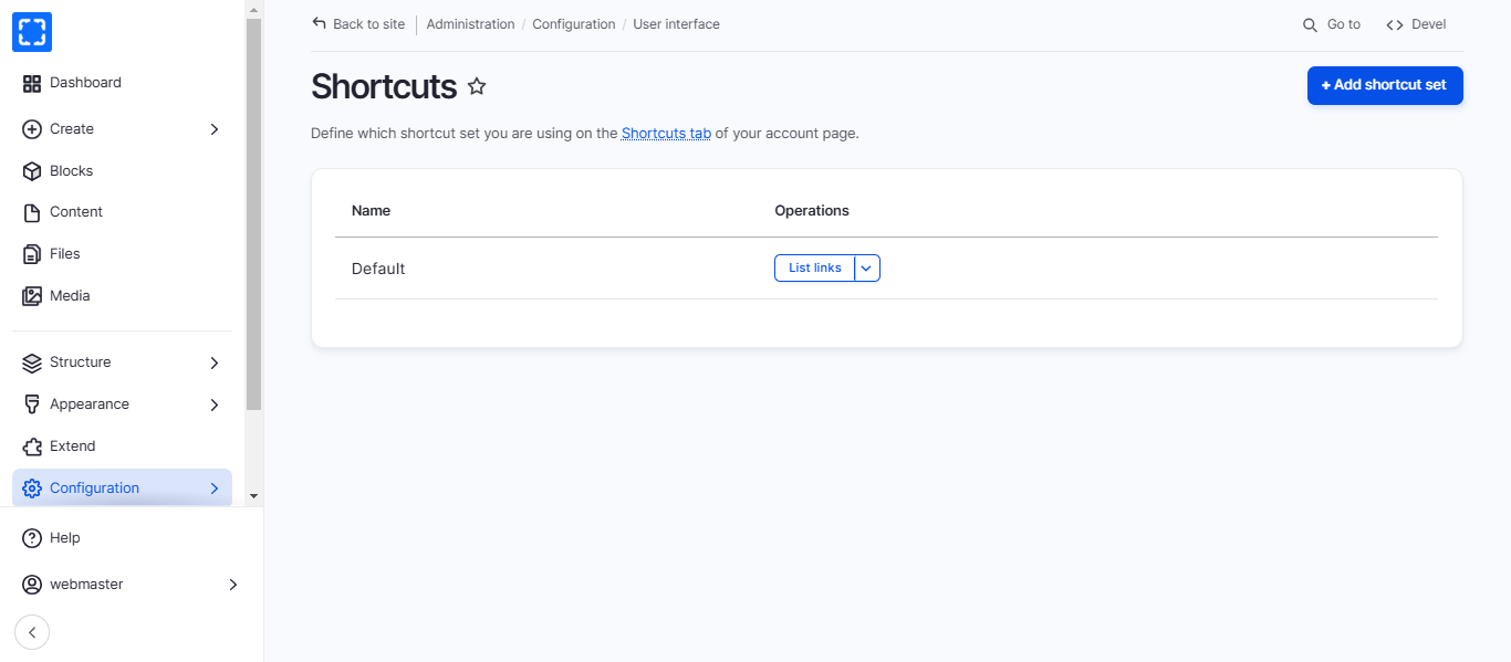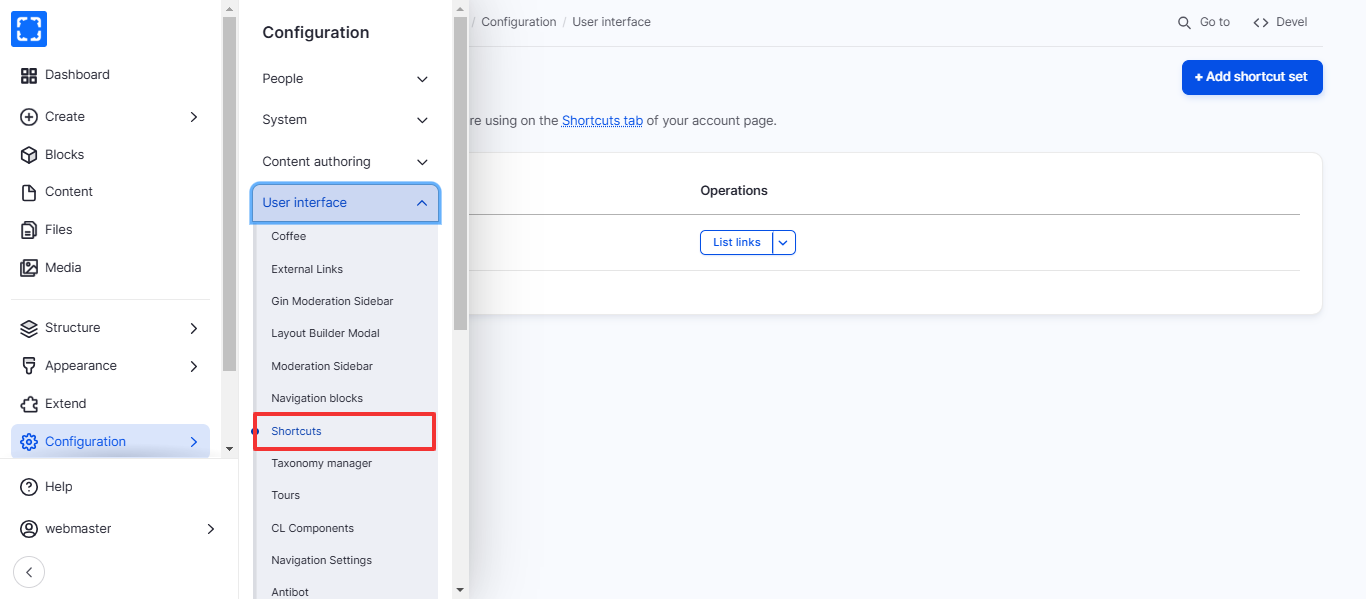 1. Form **Configuration/ User interface/&#x20;*****Shortcuts.***