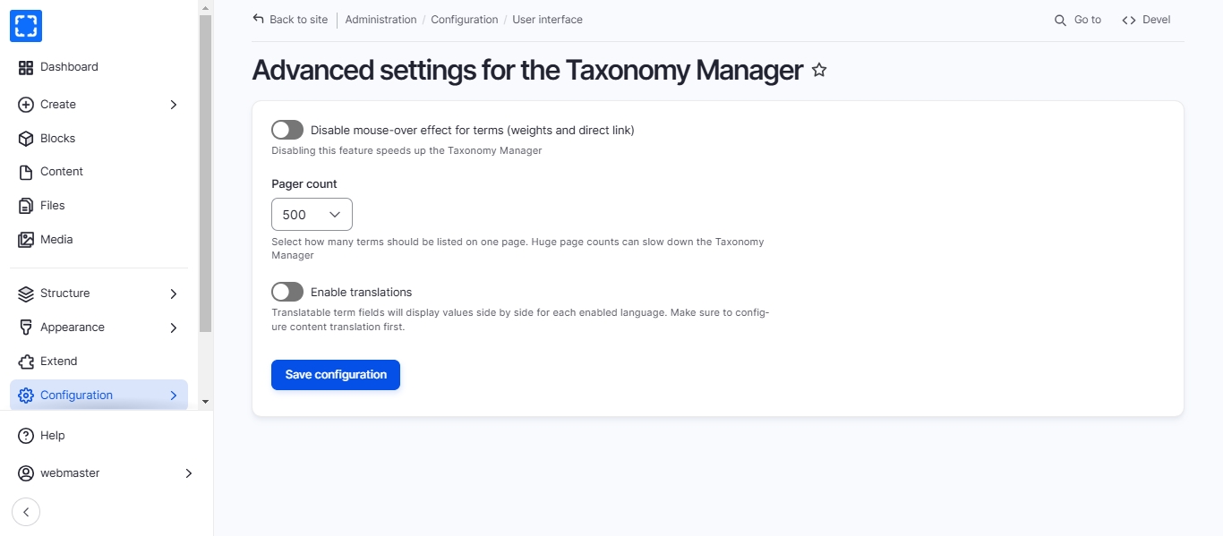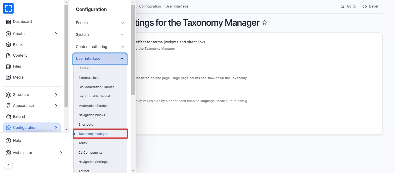 Form Configuration/ User interface/ Taxonomy Manager.