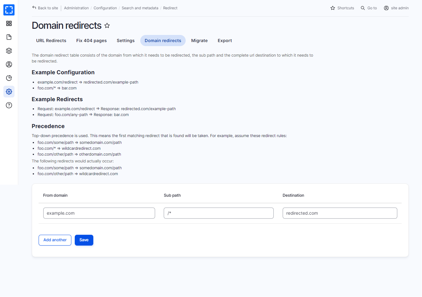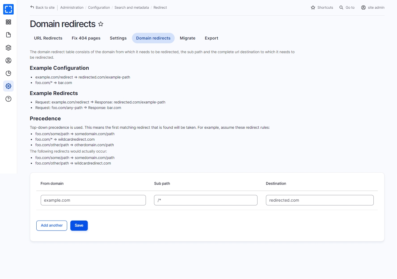 The domain redirect is accessed through Domain Redirects. The user can add the domain redirects through the domain redirect table which consists of the domain from which it needs to be redirected, the subpath, and the complete URL destination to which it needs to be redirected. The module also supports the usage of wildcard redirecting, thus many requests can be handled with one instance of domain redirect.
