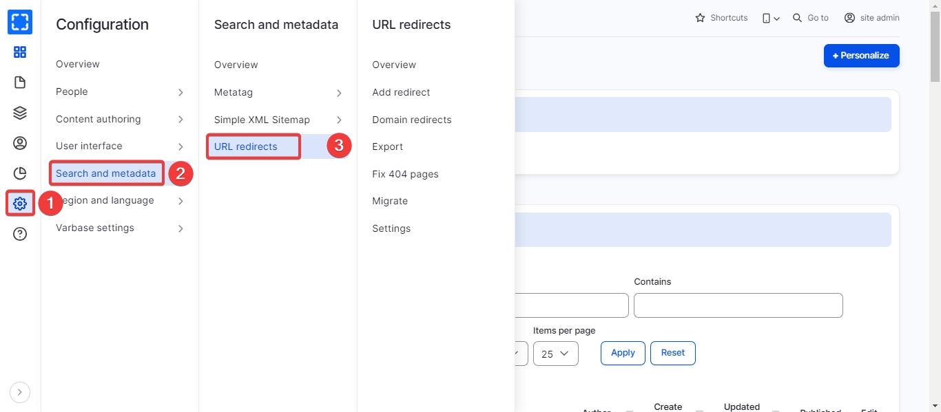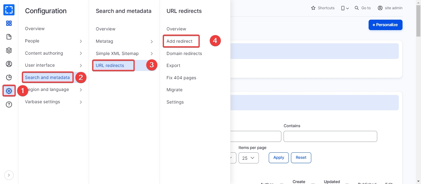 As a Super Admin, Site Admin, or SEO Admin, please navigate to Administration \ Configurations \ Search and metadata \ Redirect.