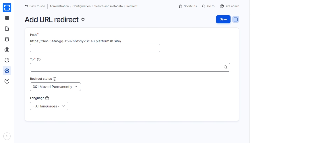 This section will explain how to add users Drupal, please navigate to Administration \ Configurations \ Search and metadata \ Redirect \ Add URL redirect.