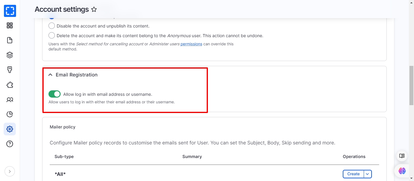 Navigate to accounts setting page, Administration \ Configuration \ People \ Account settings