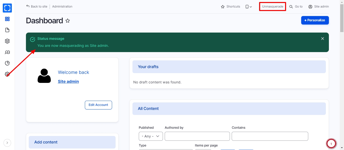 When masquerading a user, a confirmation message will appear, and the username will be changed to reflect changes, in addition to a button to unmasquerade.