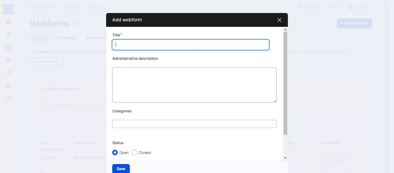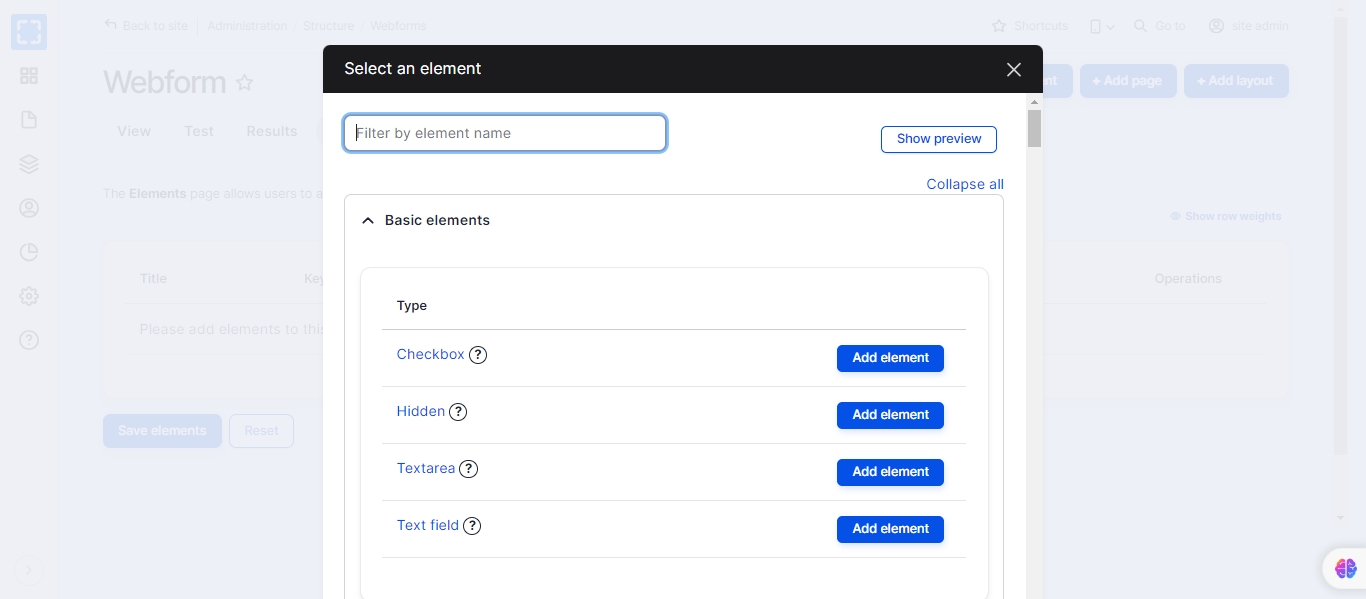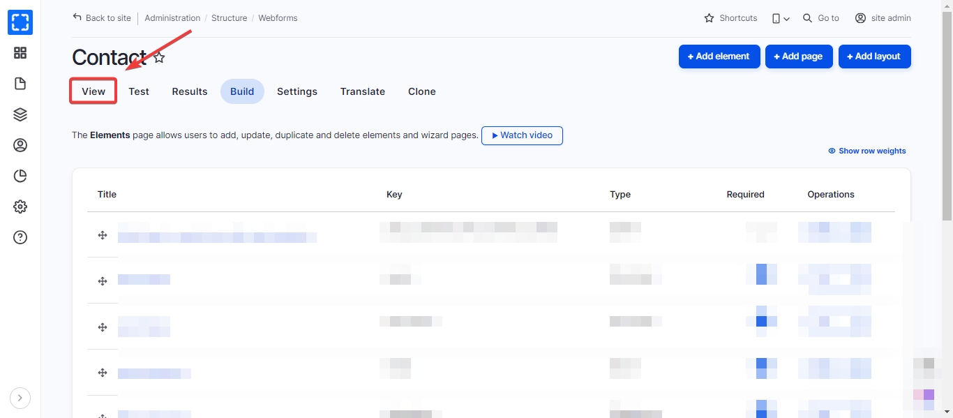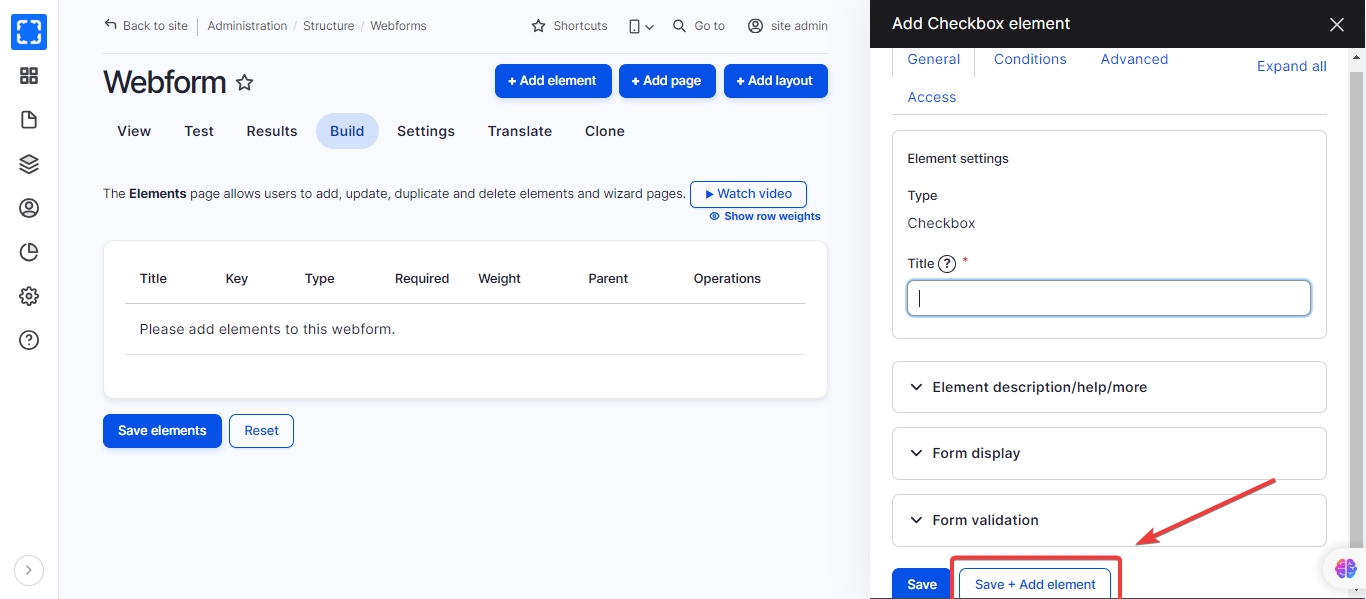 After clicking Save the site will direct you to the Build tab to add additional elements.