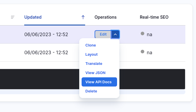 Check the expose a **"View JSON"** or **"View API Docs"** link in entity operations check boxes to list them in entity operation actions in the content page.