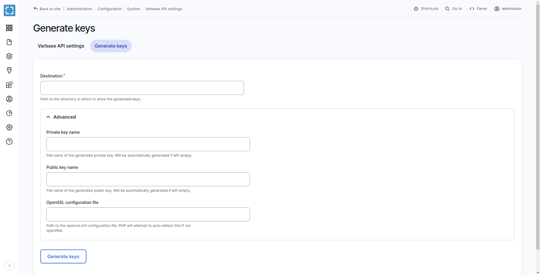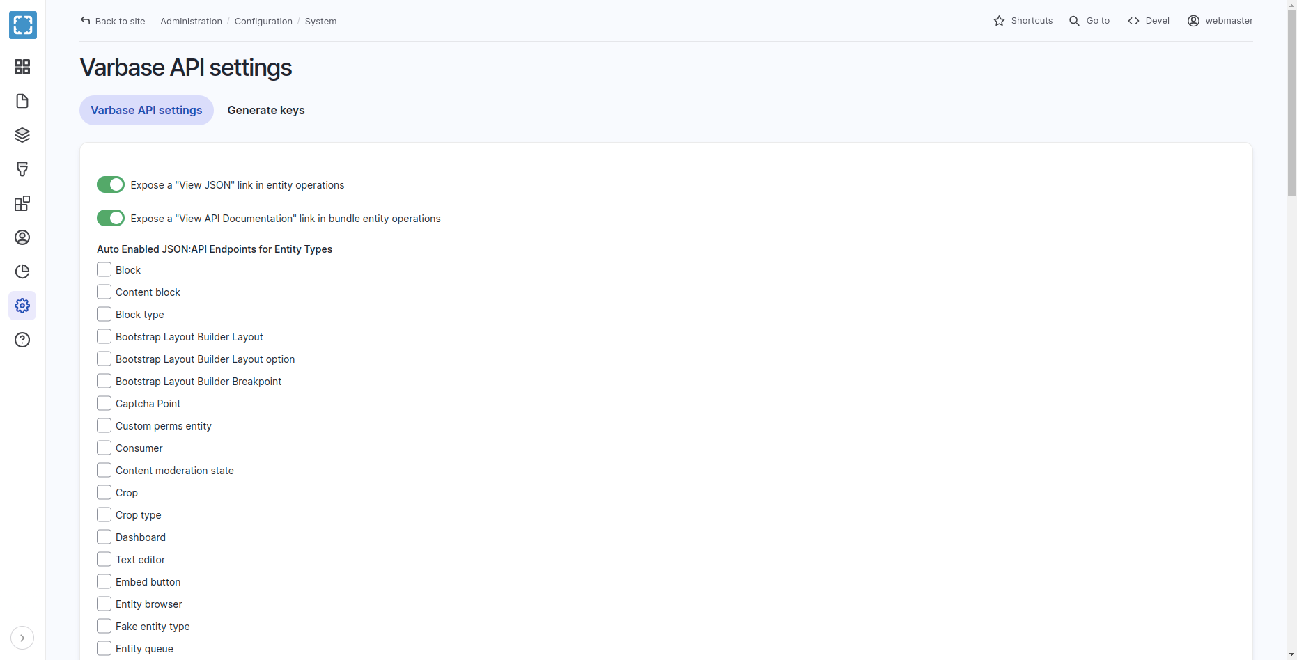 Navigate to `"/admin/config/system/varbase/api/keys"` to generate keys configurations.