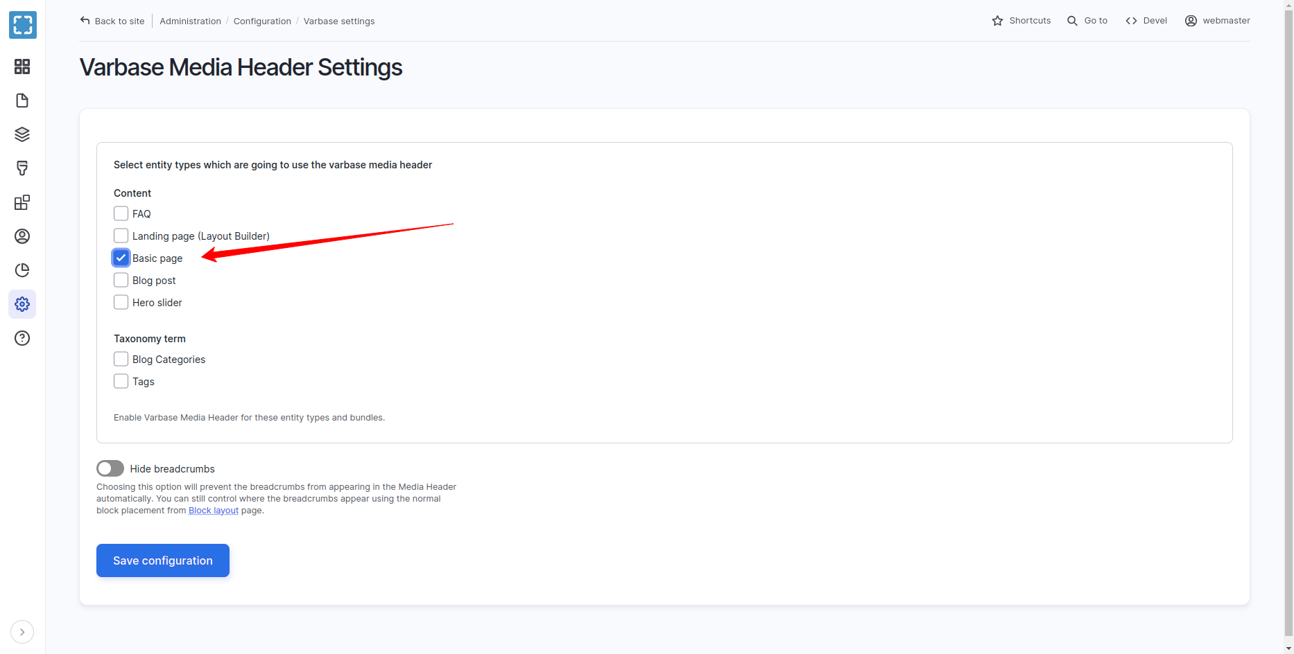 Checked Basic Page Content Type Under Varbase Media Header Settings