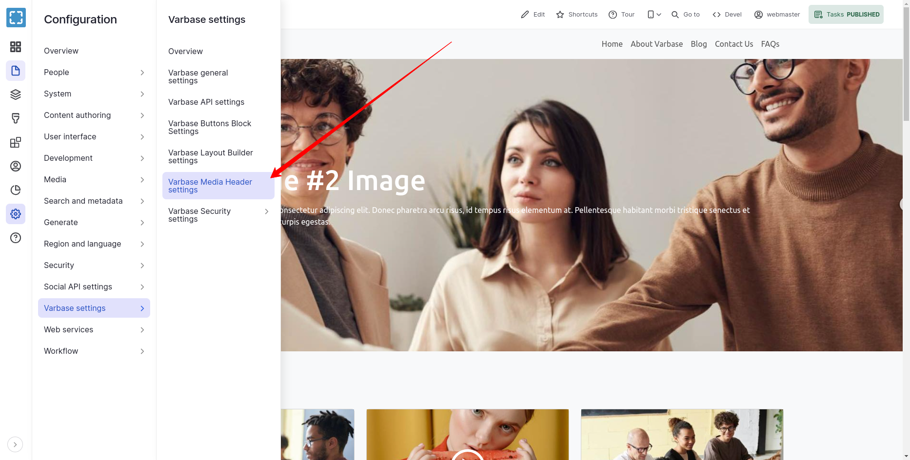 Admin Menu link to Varbase Media Header Settings