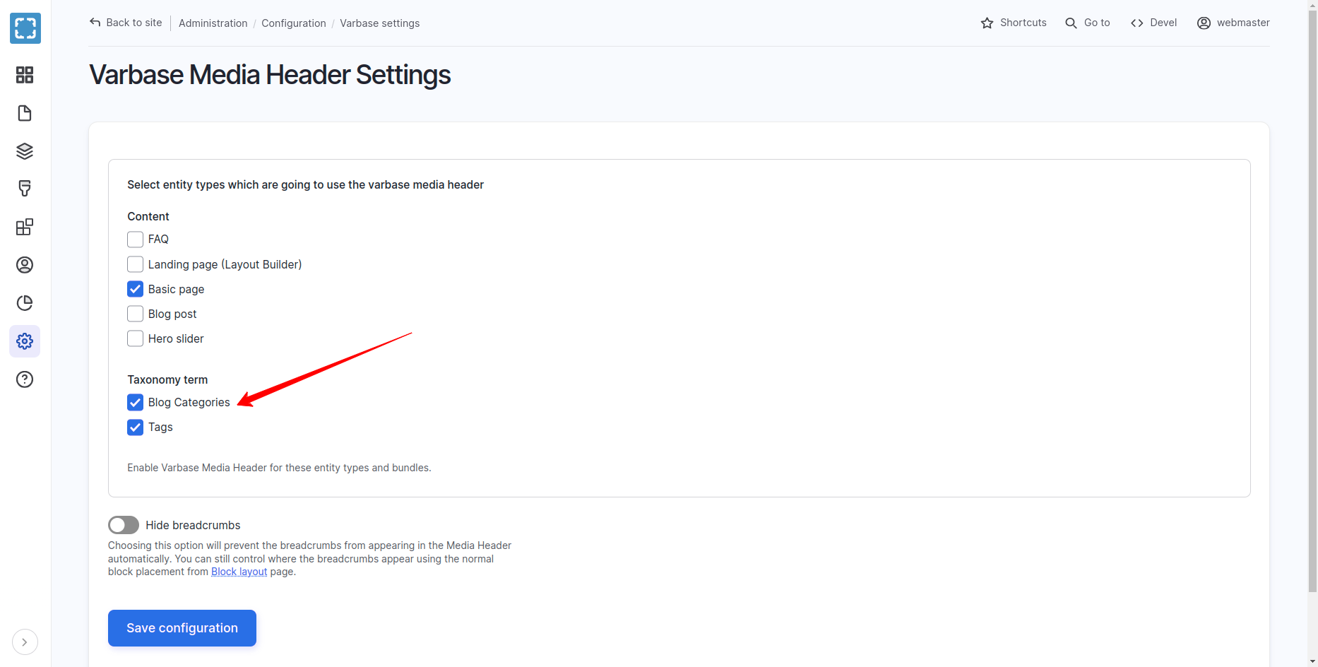 Checked Blog Categories Taxonomy Terms Under Varbase Media Header Settings