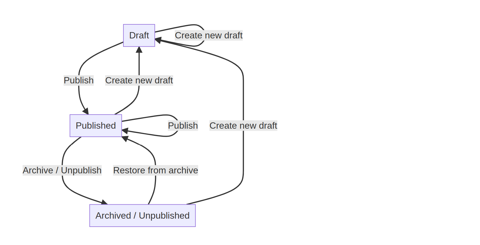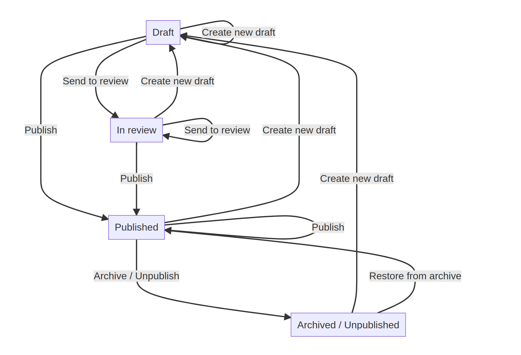 2. Editorial workflow: Draft, In review, Published, and Archived / Unpublished Useful for websites with editorial or moderation staff. You can create as many additional states as you like and define transitions between them to suit your organization's needs.