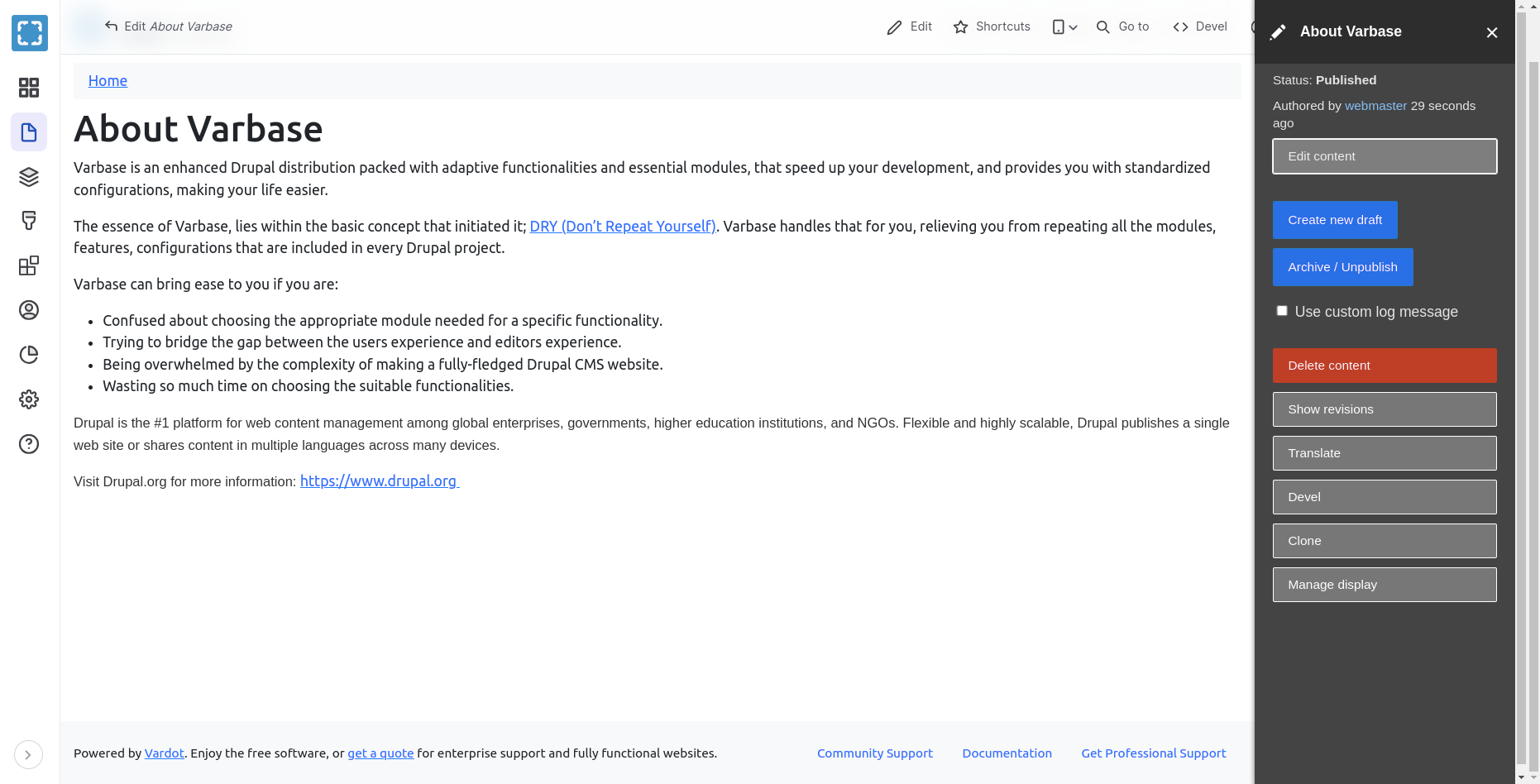 The default Varbase configuration now hides the "Local Tasks" available in content pages in the front-end theme, assuming that the Moderation Sidebar is the alternative method to edit, view, translate, or manage content.