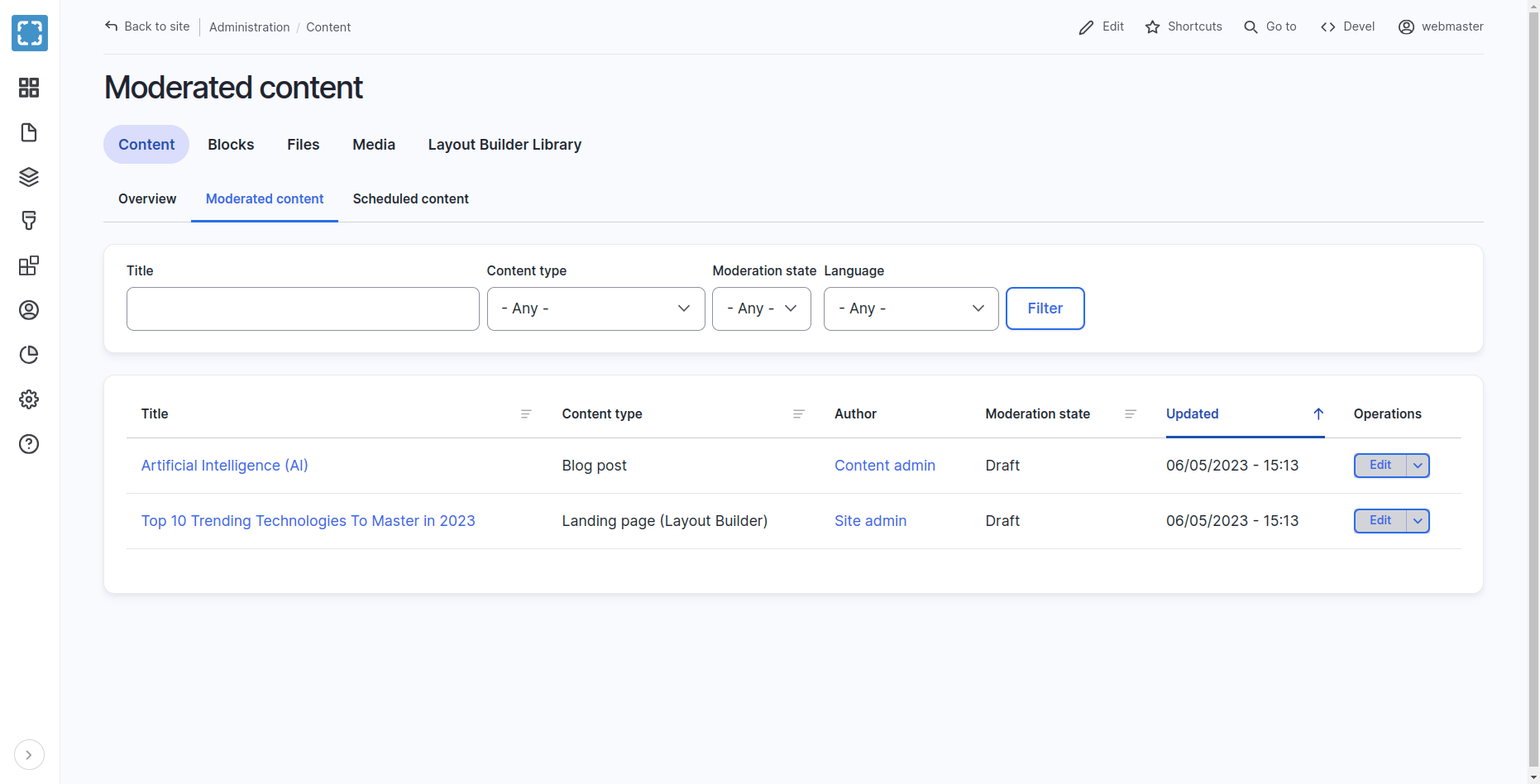 Varbase Workflow adds a simple administration view to show the available drafts and their moderation state. This view is available for all roles who can edit content.
