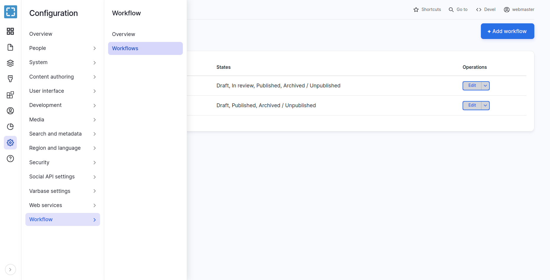 To add a new Workflow or edit an existing one, navigate to: Administration \ Configuration \ Workflow \ Workflows then click on "+Add workflow" for a new Workflow, or "Edit" under Operations for the desired Workflow.