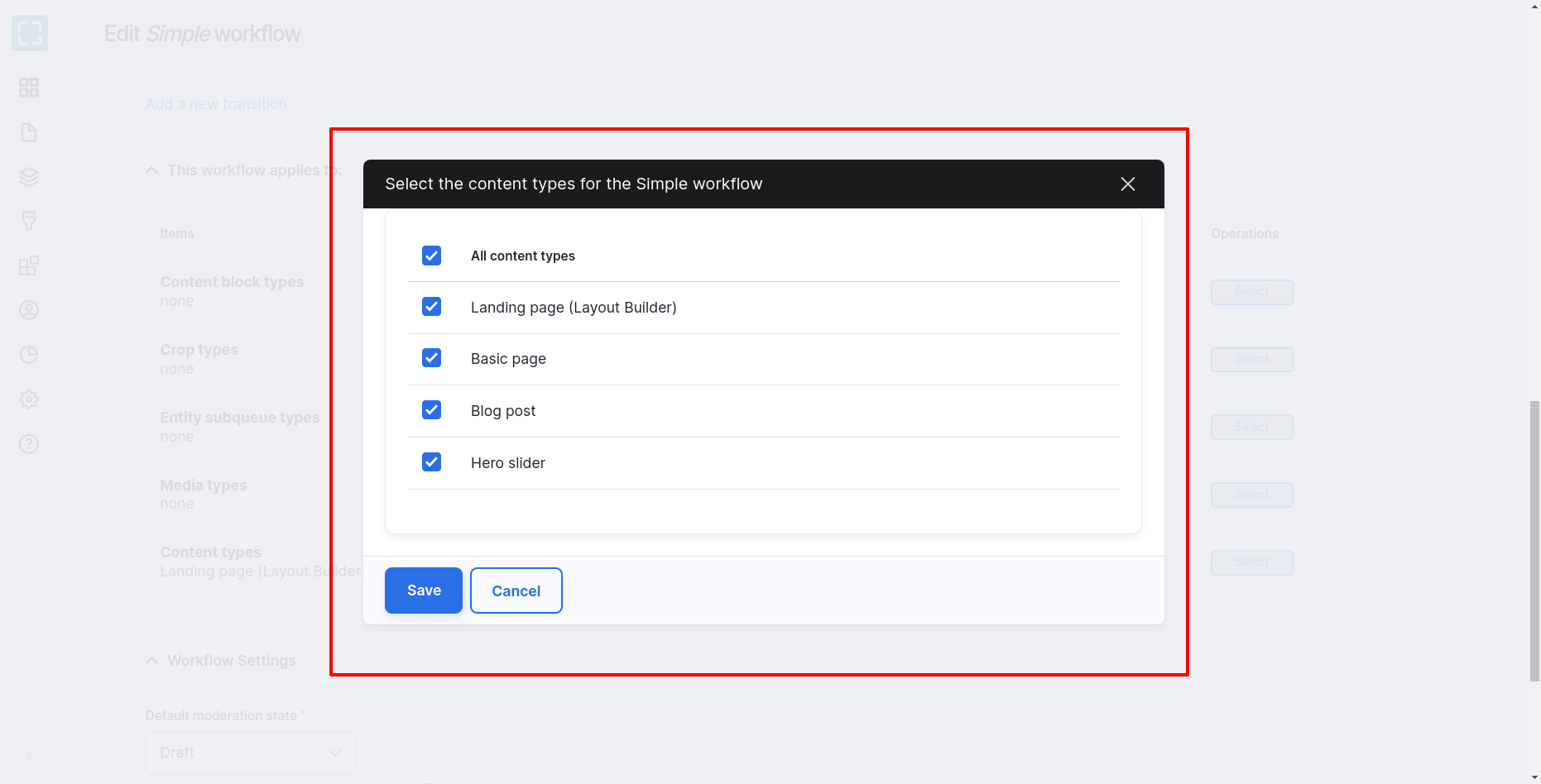 Choose your desired Content Type from the list and click on "Save". Note that Content Types assigned to another Workflow will not appear on this list.