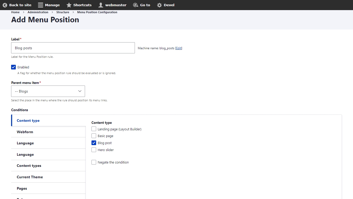 To solve this issue, we can simply by adding a position rule to the Blog post content type. Navigate to: Administration \ Structure \ Menu Position Configuration