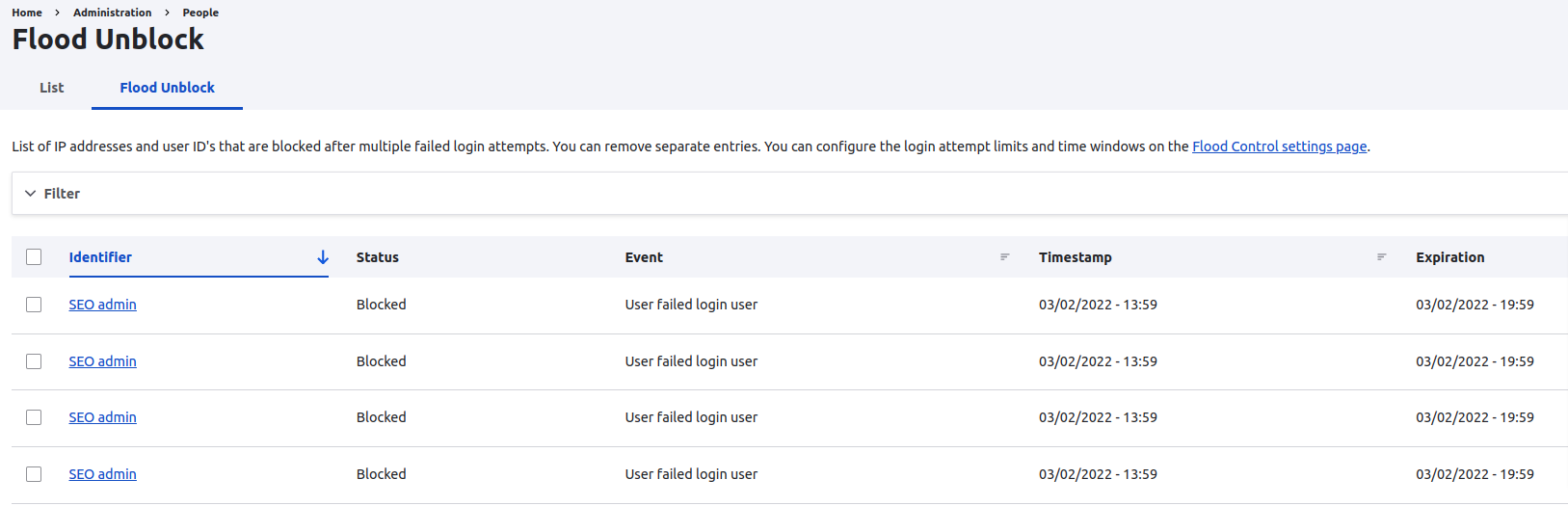 The Flood Unblock table can be accessed by navigating to Administration \ People \ Flood Unblock.