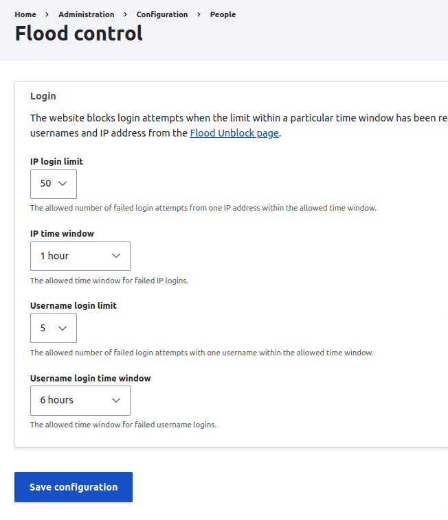 Flood Control configurations can be accessed by navigating to Administration \ Configuration \ People \ Flood Control.