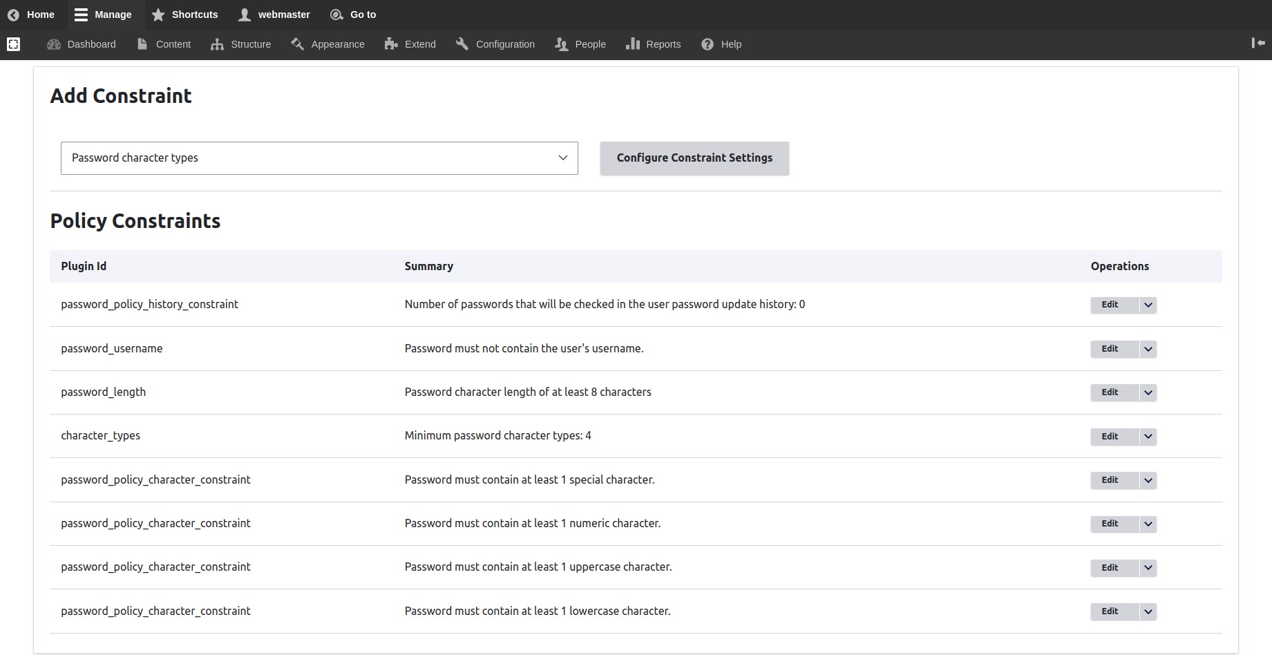 <figure><img src="https://content.gitbook.com/content/0NVNo0YmQjrLSa4Sn1ic/blobs/NfuvjluVXbGzuwhdTExE/Edit-password_policy-varbase9009d1-2.jpg" alt=""><figcaption><p>Configure Constraints - Policy Constraints</p></figcaption></figure>