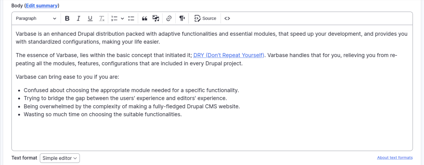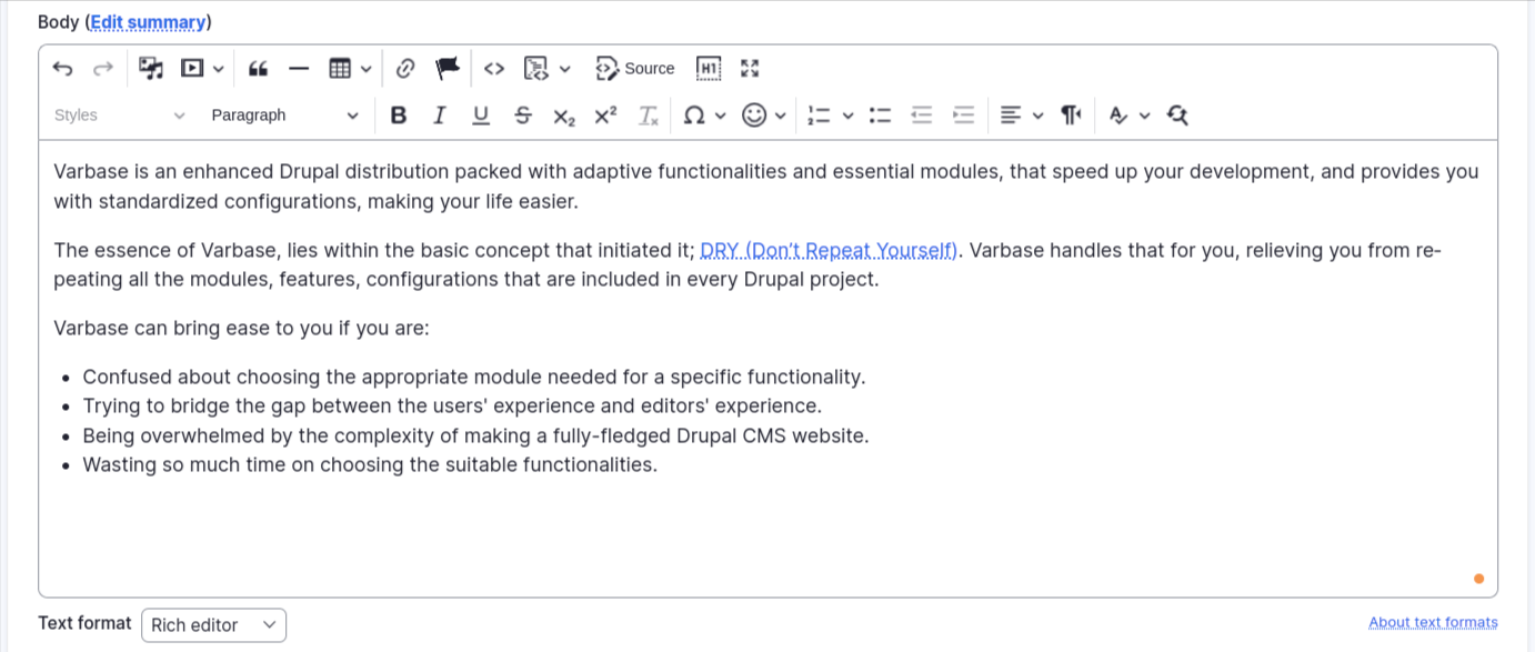 |-- varbase_editorBrings in the following core and contributed modules to your site: