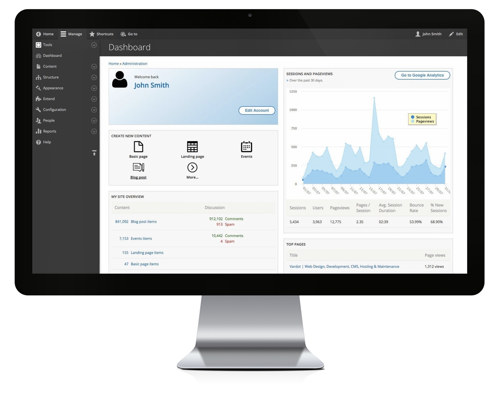 This dashboard is built on top of Total Control Admin Dashboard module, utilizing Panels, Google Analytics Reports, and several enhanced blocks and widgets for an intuitive and flexible administration experience.