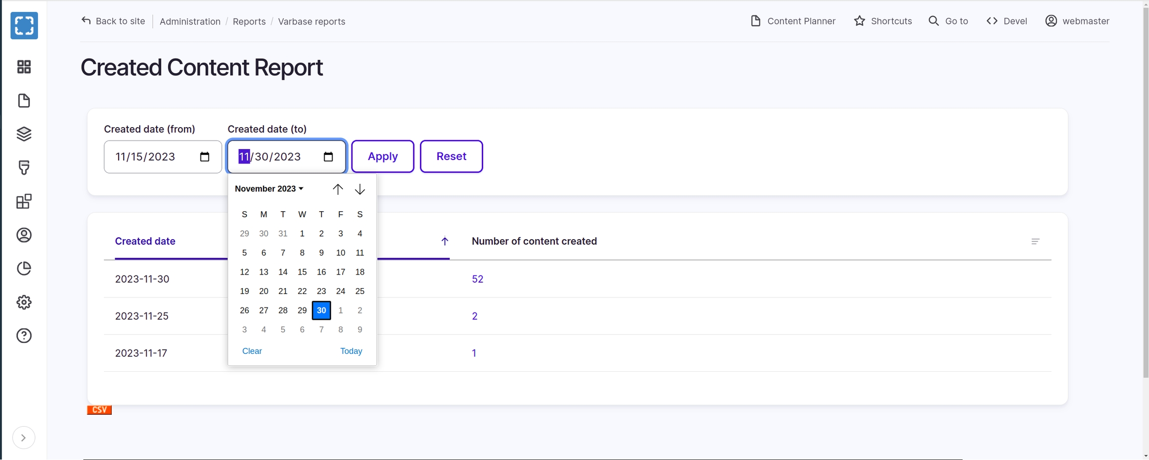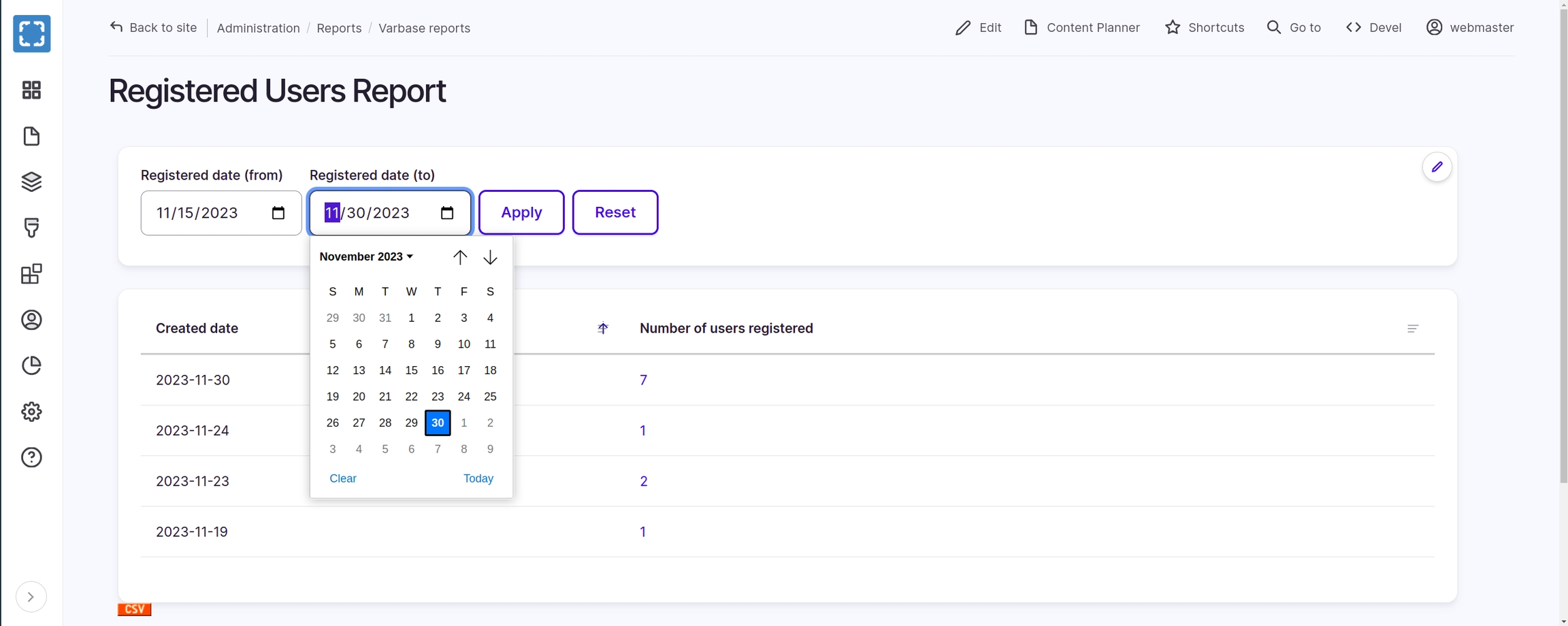 Provides a list of statistical reports. Targeted about users, content, blocks. And be able to export data.