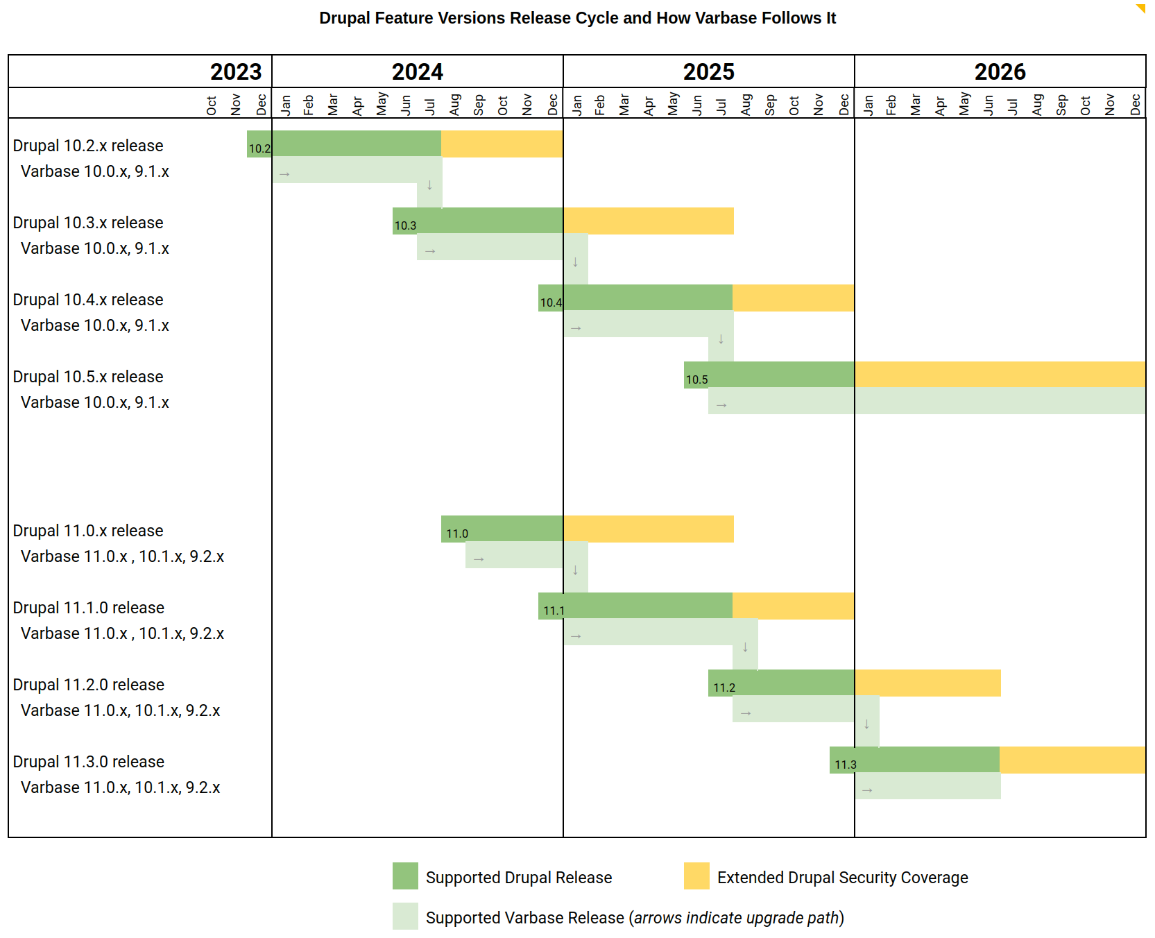 Varbase follows the Drupal 9/10/11 release cycle. Therefore, a version of Varbase is named 10.0.x uses the same **major** version of Drupal 10.